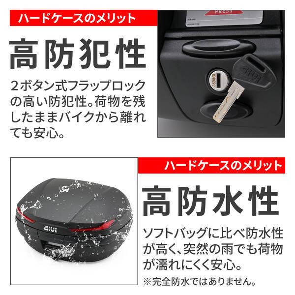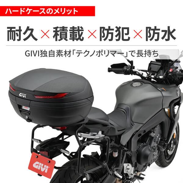 【商品説明】容量45リットルのモノキーケース。フルフェイスヘルメット2つが収納できるサイズ。2ボタン式フラップロックにより防犯性を高めています。シェルには丈夫で長持ちし時間が経っても色あせしにくい、GIVI独自開発素材の「テクノポリマー」を使用しています。・ボックス外寸:奥行436×幅567×高さ310(mm)・本体重量:4.1kg・最大積載重量:10kg●バイク用リアトップケース(モノキー)●フルフェイスヘルメット2つが収納できるサイズ●シェルにはGIVI独自開発素材の「テクノポリマー」を使用。丈夫で色あせしにくい●容量:45L、最大積載重量:10kg●ボックス外寸:奥行436×幅567×高さ310(mm)※ 未塗装品は表面処理をしていないため、表面はざらざらしています。※ キャリア本体の積載制限以上は積載しないでください。※ 防水性を考慮した設計をしておりますが、完全防水ではありません。※ 車両への取付には車種別フィッティングおよび指定モノキーベースが別途必要です。