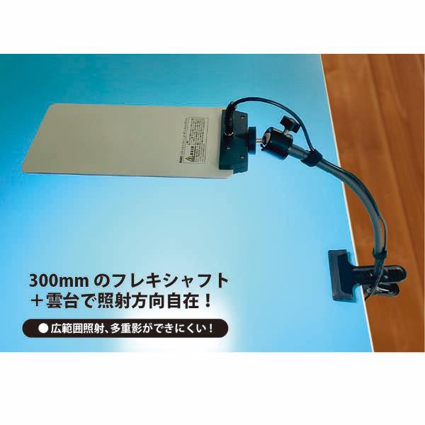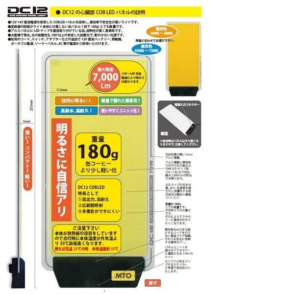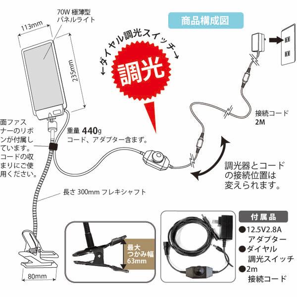 ●特長●パネルライトに300mmのフレキシャフトと雲台で照射方向自在タイプです●12Vから14V直流電源を使用したCOB(チップオンボード)LEDパネルを採用し、高効率 で安全性が高いライトです。●変換機の回路がライト自体に付属しない為パネル1枚で130g!とても軽量です。●アルミパネルにLEDチップを直接取り付けている為、放熱性が高く高寿命です。●大面積で発光、光の拡散性も180°以上の安定した拡散光で、影の少ない光源です。●最大照度:7000Lm (12Vから14V対応電源により明るさは変わります。)バッテリー駆動なら無音!発電機いらずで夜の作業も大丈夫!●4000Lm 70W 12ー14V COBLEDプレート 6000k●仕様、規格●パネルサイズ 5×112×235mm●防水規格:IP68 本体のみ●昼光色●付属品 300mmフレキシャフト 12.5V 2.8A アダプターON.OFFスイッチ可変コントロールスイッチ2m接続コード 面ファスナーリボン