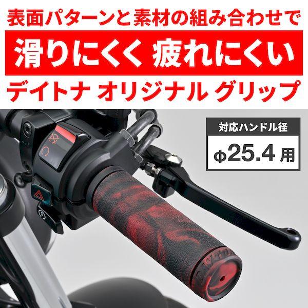 【商品説明】滑りにくく疲れにくいデイトナのオリジナルグリップ。アクセルを握ったとき滑りにくい表面パターンと、グリップ力に優れる素材を組み合わせて、長時間のライディングでも疲れにくいグリップに仕上げました。レザー調に見えるシボタイプのツバを無くし、クローズドエンド化したクルーザー向けモデル。マーブルの模様は、1本ずつ全て異なります。●φ25.4ハンドル用グリップ●グリップ長:125mm●エンド非貫通●滑りにくい表面パターン、握りやすい素材でグリップ力に優れる●長時間のライディングでも疲れにくい※ マーブル模様は一本ずつ異なるため、左右で揃えることができません。また、掲載画像とも異なります。予めご了承ください。