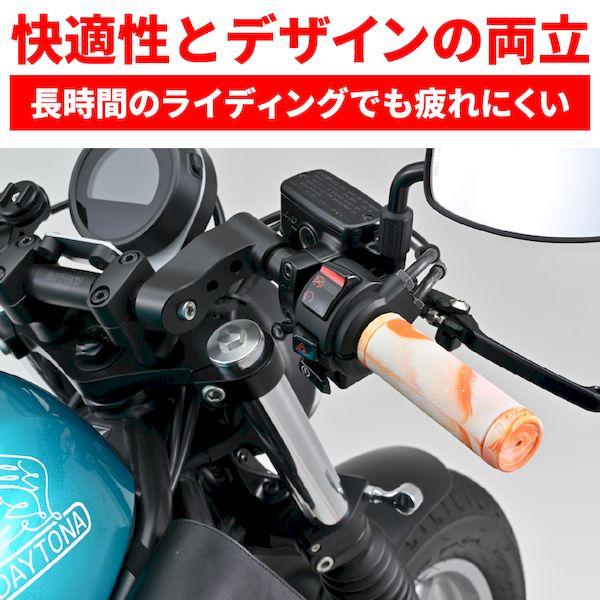 【商品説明】滑りにくく疲れにくいデイトナのオリジナルグリップ。アクセルを握ったとき滑りにくい表面パターンと、グリップ力に優れる素材を組み合わせて、長時間のライディングでも疲れにくいグリップに仕上げました。レザー調に見えるシボタイプのツバを無くし、クローズドエンド化したクルーザー向けモデル。マーブルの模様は、1本ずつ全て異なります。●φ25.4ハンドル用グリップ●グリップ長:125mm●エンド非貫通●滑りにくい表面パターン、握りやすい素材でグリップ力に優れる●長時間のライディングでも疲れにくい※ マーブル模様は一本ずつ異なるため、左右で揃えることができません。また、掲載画像とも異なります。予めご了承ください。