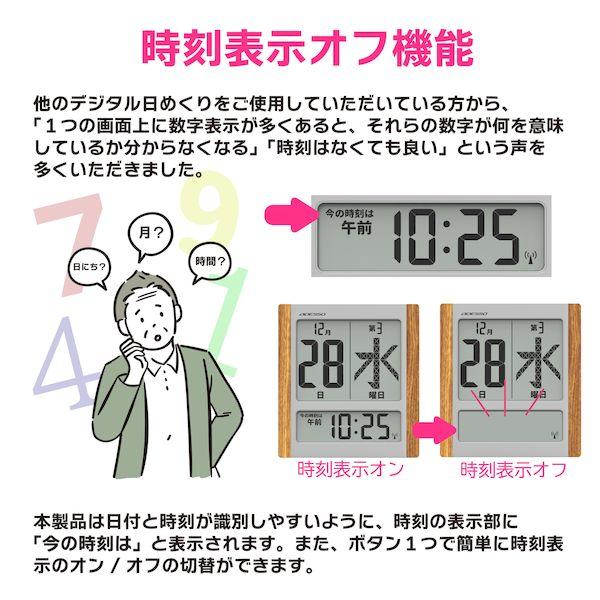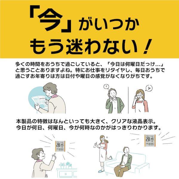 【商品説明】●大きな時刻、日にち、曜日、3つの表示をバランスよく配置。一目で「今」がいつかわかるデジタル日めくりカレンダー電波時計です。置いても掛けても使用できる置き掛け兼用。遠目にもよく見え、よくわかるデザインで高齢の方に使いやすくなっています。●日付のみを知りたい方向けに時刻表示をオフにする機能も備えています。電波時計なので、時刻合わせの必要がなく常に正しい時刻を知る事ができます。●寸法:高さ241mm×幅223mm×奥行25mm●質量:582g●材質:ABS樹脂●電源:単3乾電池×4(付属)●時計タイプ:電波時計●機能:日付表示、曜日表示、第何曜日表示、12/24時間表示切替、時間帯表示(午前・午後表示にも切替可能)、時刻表示オフ、電池切れ注意アイコン付き、置き掛け兼用