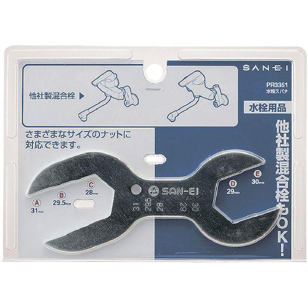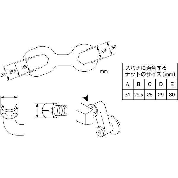 三栄水栓製作所メーカーお問い合わせ:03-6383-7281【特長】●水栓が故障した場合の補修や、取り付けに使用するスパナです。●ほとんどのメーカーの混合栓に対応しています。【用途】●水栓補修、取付用。【仕様】●適用寸法(mm):28、29、29.5、30、31●全長(mm):163【材質/仕上】●鋼【原産国】日本