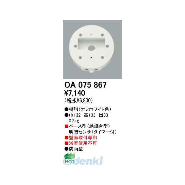 オーデリックメーカーお問い合わせ:03-3332-1123明暗センサ OA075867寸法:巾132 高133 出33製品重量(kg):0.2本体材質:樹脂(オフホワイト色)防湿防雨対応:防雨型●ベース型(絶縁台型)明暗センサ(タイマー付)注意事項:壁面取付専用注意事項:浴室使用不可