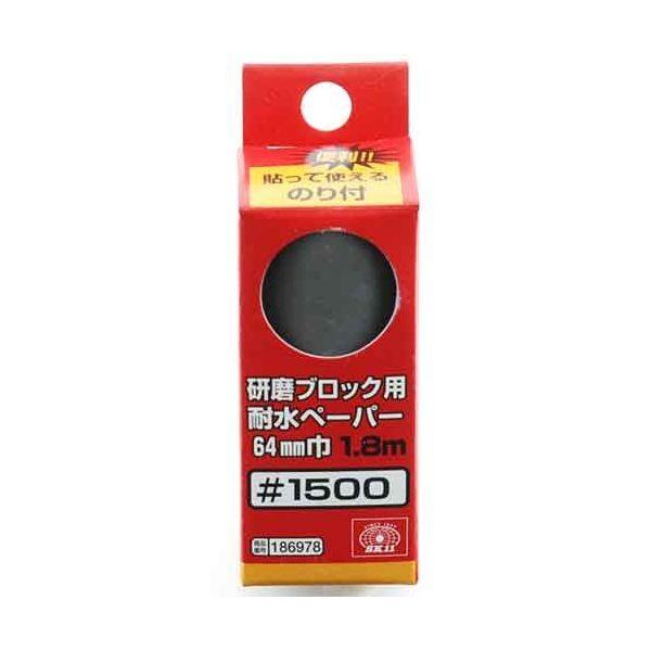 【用途】研磨ブロック64mm巾用耐水ペーパー。【機能・特徴】ペーパーが磨耗したら、新しい面を引き出してお使い下さい。貼って使えるのり付きです。【仕様】●適合機種:研磨ブロック64mm巾。●粒度:1500。●長さ:約1.8m。【注意事項ほか】粒度を確認の上、傷がつくと困るものには使用しないでください。目立たない部分で一度試してからご使用ください。大工道具 砥石ペーパー 研磨ブロック