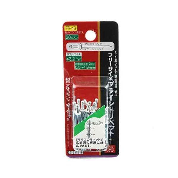 【用途】部材と母材の締結。【機能・特徴】広範囲の板厚に対応できるハンドリベッター用のブラインドリベットです。フランジ(リベット本体)はアルミ製でサビに強くなっています。【仕様】●リベット径:3.2mm。●下穴寸法:3.3~3.4mm。●締付可能板厚:0.5~4.8mm。●引張強度:100kg。●入数:30本入。●フランジ:アルミ。●シャフト:スチール。【注意事項ほか】作業時は保護メガネを着用してください。作業工具 クランプバイス DIY クランプバイス