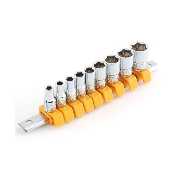 【用途】差込角6.35mmのミリサイズ対応ソケット9個組セット。【機能・特徴】新型ソケットホルダーを採用しました。ワンタッチ操作で、簡単にソケットを取外せ、確実にソケットを取付けられます。六角ボルト(ミリ)に対応します。素材には優れた強度・耐衝撃性を持つクロームバナジウム鋼を使用したソケットです。【仕様】●差込角:6.35mm(1/4インチ)。●サイズ内容:5・5.5・6・7・8・10・12・13・14mm。●ソケットホルダー付。●クリップ色:黄。●ソケット:クロームバナジウム鋼。作業工具 ソケット ソケットレンチセット