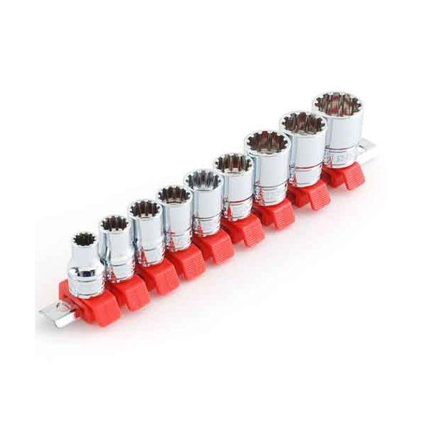【用途】差込角9.5mmのマルチに対応するソケット9個組セット。【機能・特徴】1サイズのソケットでミリ・インチ・トルクスなどの色々なネジに対応できます。新型ソケットホルダーを採用しました。ワンタッチ操作で、簡単にソケットを取外せ、確実にソケットを取付けられます。六角ボルト・ナット(ミリ・インチ・トルクス)に対応します。【仕様】●差込角:9.5mm(3/8インチ)。●サイズ内容:8・10・11・12・13・14・16・17・19mm。●対応サイズ内容(インチボルト):5/16・3/8・7作業工具 ソケット ソケットレンチセット