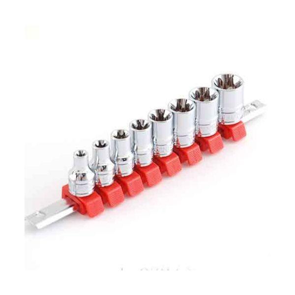 【用途】E型トルクスねじの締め付け・緩め作業。【機能・特徴】新型ソケットホルダーを採用しておりますので、ワンタッチ操作で簡単にソケットを取り外せます。新型ソケットホルダーで、確実にソケットを取り付けられます。E型トルクスネジに対応しております。素材には優れた強度・耐衝撃性を持つクロームバナジウム鋼を使用しております。【仕様】●差込角:9.5mm(3/8インチ)。●サイズ内容:E6・E8・E10・E12・E14・E16・E18・E20。●対象ネジ:E型トルクスネジ。●クリップ色:赤。作業工具 ソケット ソケットレンチセット
