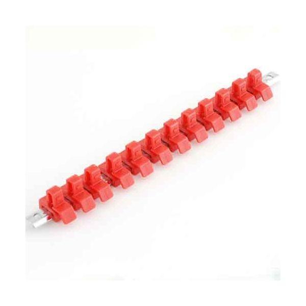 【用途】ソケットの整理、収納。【機能・特徴】ワンタッチ操作で簡単にソケットを取り外せます。確実にソケットを取り付けられます。【仕様】●差込角:9.5mm(3/8インチ)。●クリップ数:12個。●全長:290mm。●クリップ色:赤。●クリップ:ポリアセタール。●レール:鉄。【注意事項ほか】移動などの際には、確実に取付が出来ているか確認してください。本来の目的、用途以外での使用はしないでください。作業工具 ソケット アクセサリー