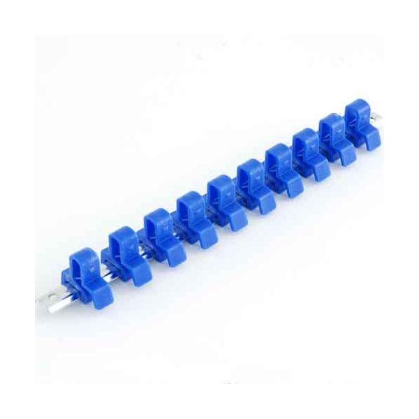 【用途】ソケットの整理、収納。【機能・特徴】ワンタッチ操作で簡単にソケットを取り外せます。確実にソケットを取り付けられます。【仕様】●差込角:12.7mm(1/2インチ)。●クリップ数:10個。●全長:290mm。●クリップ色:青。●クリップ:ポリアセタール。●レール:鉄。【注意事項ほか】移動などの際には、確実に取付が出来ているか確認してください。本来の目的、用途以外での使用はしないでください。作業工具 ソケット アクセサリー