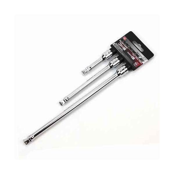 【用途】深くて狭い場所でハンドル操作がしにくい場合のソケットの延長。【機能・特徴】首振りと固定のどちらにも設定可能です(首振り角度10度)。【仕様】●差込角:9.5mm(3/8インチ)。●クロームメッキ鏡面仕上。●クロームバナジウム鋼。●セット内容:75mm×1・150mm×1・250mm×1。作業工具 ソケット アクセサリー