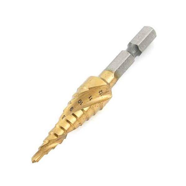【用途】薄鉄板(一般鋼)・アルミなどの穴あけ・穴拡大・バリ取り作業。【機能・特徴】独自の刃先角度設計により切削抵抗を軽減し、バッテリー効率が良く充電インパクトドライバーでの使用に最適です。刃先シンニング加工により、材料への食いつきが良くセンターポンチ不要です。チタンコーティング仕様により耐熱性に優れ、長寿命です。【仕様】●サイズ:3・4・5・6・7・8・9・10・11・12mm。●6.35mm六角軸。●段数:10段。●最大穴あけ可能板厚:薄鉄板・アルミ2.0mm以下。●対応機種:充電先端工具 鉄工アクセサリ 鉄工穴あけ