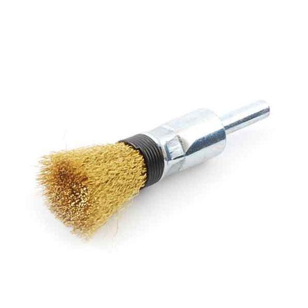 【用途】銅・真鍮又は木材などの表面研磨、汚れ落とし、バリ取り。【機能・特徴】パイプの内面研磨やクリーニングなど、狭い場所やコーナー部に便利です。変木・木の根などの仕上げにも使用出来ます。線のこしがやわらかく、研磨物を傷つけません。【仕様】●軸径:6mm。●軸長:25mm。●直径:約15mm。●筒長:25mm。●線径:0.15mm。●線丈:30mm。●対応機種:電気ドリル・フレキシブルシャフト・エアードリル。●線:真鍮製。【注意事項ほか】保護メガネなど安全保護具を着用して正し先端工具 ドリルアクセサリ 軸付 砥石ヤスリワイヤ