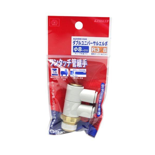 【用途】エア配管用チューブ管継ぎ手。【機能・特徴】めねじ部からの直角方向の分岐配管に使用します。分岐側取付部は独立しており方向はフリーです。【仕様】●適用チューブ材質:ポリウレタン・ナイロン。●適用チューブ外径:8mm(×2口)。●接続ねじ:おねじR(PT)3/8。●使用圧力範囲:-0.1~1MPa。●周囲温度:-5~60度。●本体材質:PP・C3604・SUS304・NBR・他。電動工具 エアーツール チューブ継ぎ手