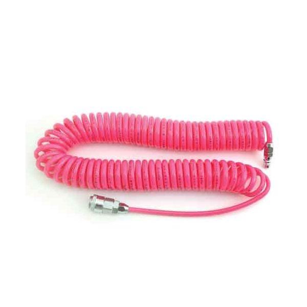 【用途】エアーホース。【機能・特徴】伸ばして作業ができ、縮めて収納できる伸縮で邪魔にならないコイル状のエアホースです。ワンタッチソケット付きで、便利です。【仕様】●サイズ:内径5mm×外径8mm。●最高使用圧力:0.7mpa。●使用有効長:6.3m。●ホース長:9m。●カラー:ピンク。●ポリウレタン樹脂。【注意事項ほか】使用前に必ず取扱説明書を読んでください。エアー工具以外の用途に絶対に使用しないで下さい。異常を感じたら絶対に使用しないでください。電動工具 エアーツール ホースリール