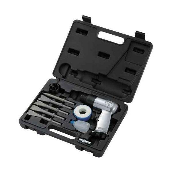 【用途】コンクリート・モルタル等のハツリ作業、金属の切断作業等。【機能・特徴】作業性の良い軽量・コンパクトボディです。コンクリート・モルタル・石材のハツリ作業に最適です。先端のチゼルを取り替えることで、ボルトや鉄板の切断作業も可能です。【仕様】●全長:180mm。●本体重量:1100g。●打撃数:4500回/分。●空気消費量:114L/min。●空気取り入れ口:PT1/4配管用メネジ。●使用圧力:0.6MPa。●セット内容:本体・メタルシートチゼル(A・B)・フラットチゼル・ポイ電動工具 エアーツール 工具