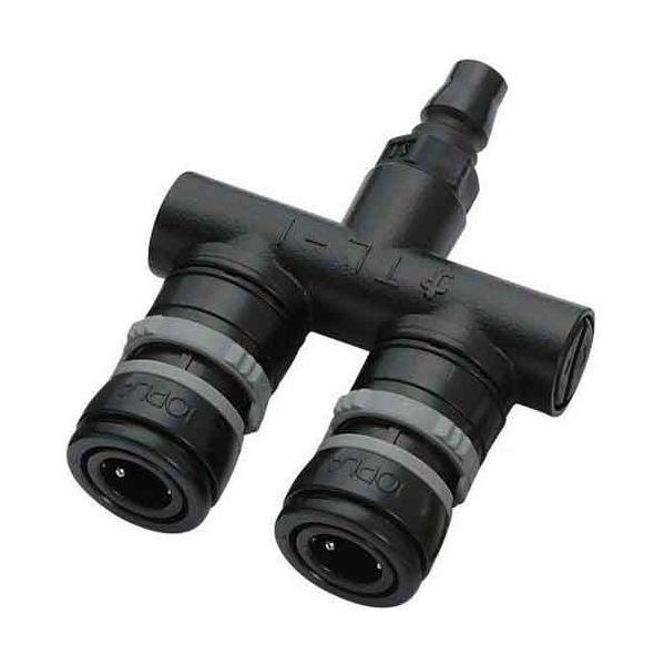 【用途】ツインカプラ2分岐配管用(取入口1/4インチカプラ取出口ソケット2ヶ所)。【機能・特徴】ハイカプラ(20型・30型・40型)との互換性を持たせてあるので汎用性も抜群です。ソケットが使用する方向に360度自在に動くので作業性を大幅に向上します。防暴性にも富んでいます。【仕様】●取入口:1/4インチカプラ。●2分岐配管用。●適用流体:空気。●常用圧力:1.0MPa。●本体:ポリアクセタール(POM)。【注意事項ほか】必ず本製品を配管回路から取り外し、圧力がかかっていない状態で電動工具 エアーツール カプラジョイント