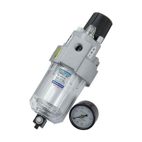 【用途】エアー配管中の水分、ほこり除去。【機能・特徴】通常はマニュアルドレン排出、空気圧が0.5kgf/cm2以下になるとドレンを自動排出します。二重ボトルと透明ガードの採用により、360度どこからでも鮮明にドレンのチェックが可能です。エアー工具に一定量のオイルを自動的に給油するので、めんどうな給油作業が不要です。ボトル脱着、ドレン排出、圧力設定ロックはすべてワンタッチ操作を実現しました。フィルタ・減圧弁・リブリケーターの3機能のワンボディー・ワンケース化により省スペース、ローコストを実現し電動工具 エアーツール 圧力計機器