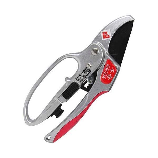 【用途】庭木の剪定、整枝作業。【機能・特徴】ラチェット機能式で、従来の約1/3の力で楽々切断ができます。軽量・丈夫なアルミボディを採用しています。スポンジ部分に刃物手入れ油をつけて、刃部の手入れに使える手入れツール付きです。錆び、ヤニ、汚れに強いフッ素コート刃を採用しています。樹脂付きグリップで、手になじみ滑りにくく、切断時の衝撃も吸収します。【仕様】●全長:約200mm。●生木切断能力:20mmまで。●刃部:刃物鋼。●ハンドル部:アルミ。【注意事項ほか】鋭利な刃物ですので、怪園芸道具 鋏 剪定鋏