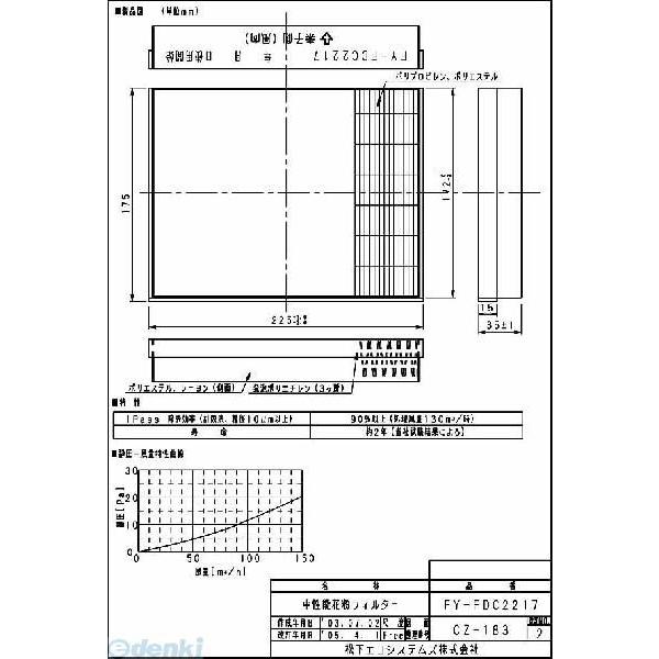 パナソニック電工 FY-FDC2217 取替えフィルターFY-FDC2217品番 FY-FDC2217品名 交換用中性能フィルター 熱交気調(カセット形熱交ユニット)用用途 居間、その他特長●除去効率:計数法にて粒径10μ以上、90%以上●適用機種:FY-VB5A、FY-13TB5Aお願い●2年に1回を目安に交換してください。