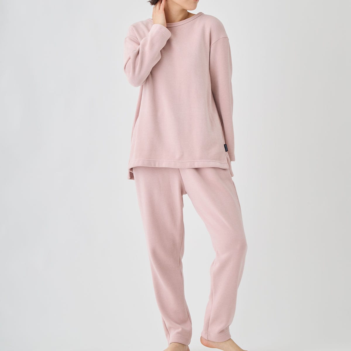 トップスはセーターのように優しく体を包み、ほどよいゆとりとドロップショルダーのリラックスシルエット。