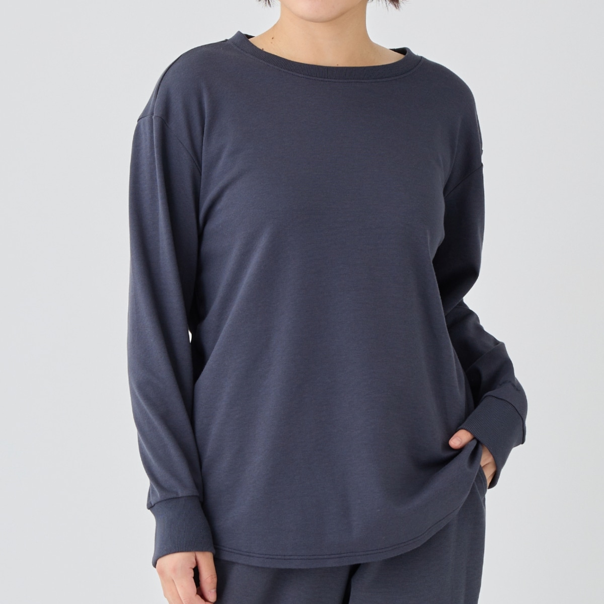 ほどよいゆとりと後ろ丈が長いシャツテイルの裾で、気になる腰回りやヒップをカバー。 首回りと袖にリブを使用し、あたたかさを閉じ込めてくれます。