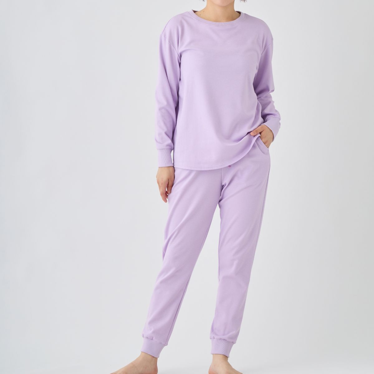 トップスはほどよいゆとりと後ろ丈が長いシャツテイルの裾で、気になる腰回りやヒップをカバー。 首回りと袖にリブを使用し、あたたかさを閉じ込めてくれます。