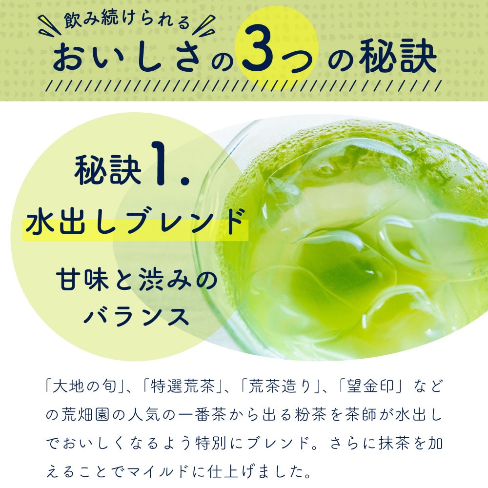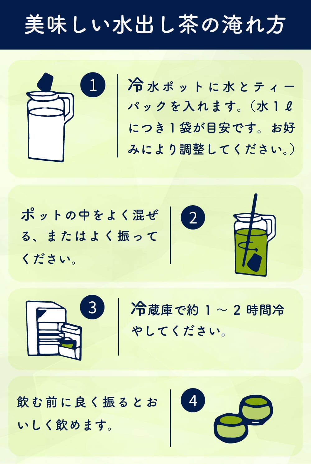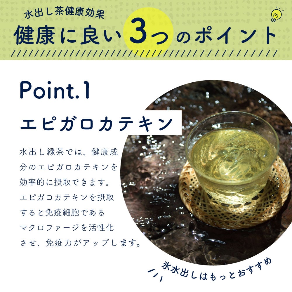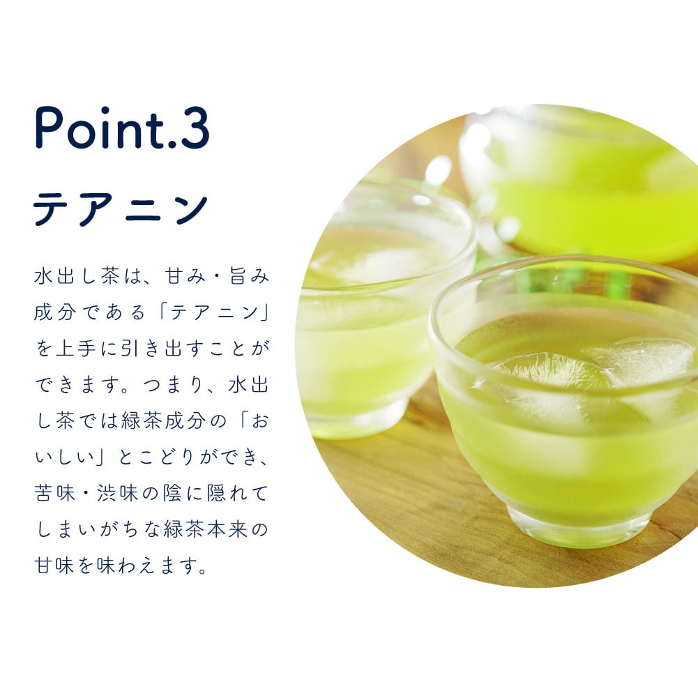 水出し茶は、甘み・旨み成分である「テアニン」を上手に引き出すことができます。つまり、水出し茶では緑茶成分の「おいしい」とこどりができ、苦味・渋味の陰に隠れてしまいがちな緑茶本来の甘味を味わえます。