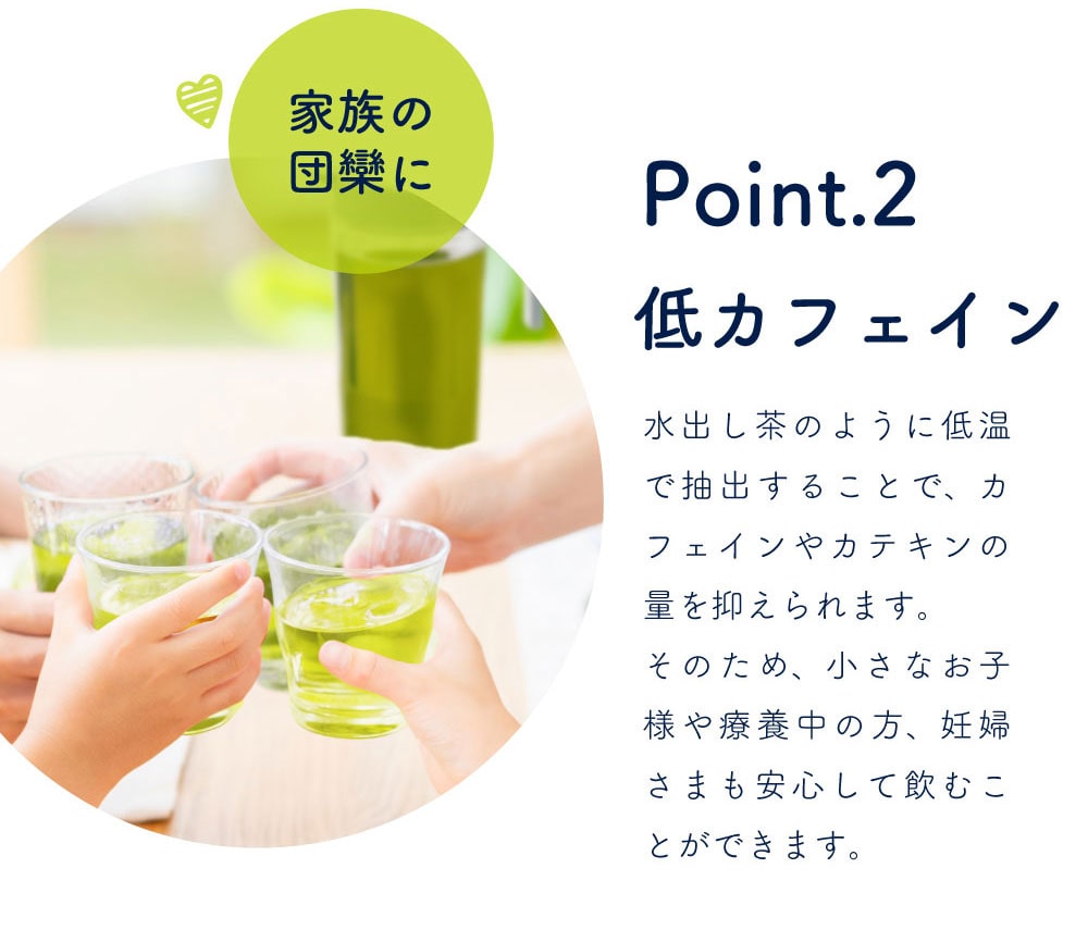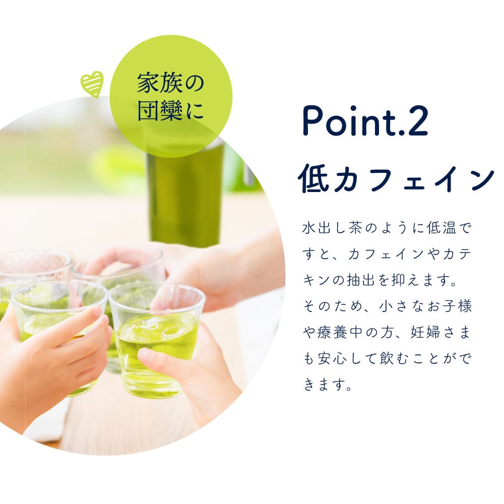 家族の団欒に。水出し茶のように低温で抽出することで、カフェインやカテキンの量を抑えられます。 そのため、小さなお子様や療養中の方、妊婦さまも安心して飲むことができます。