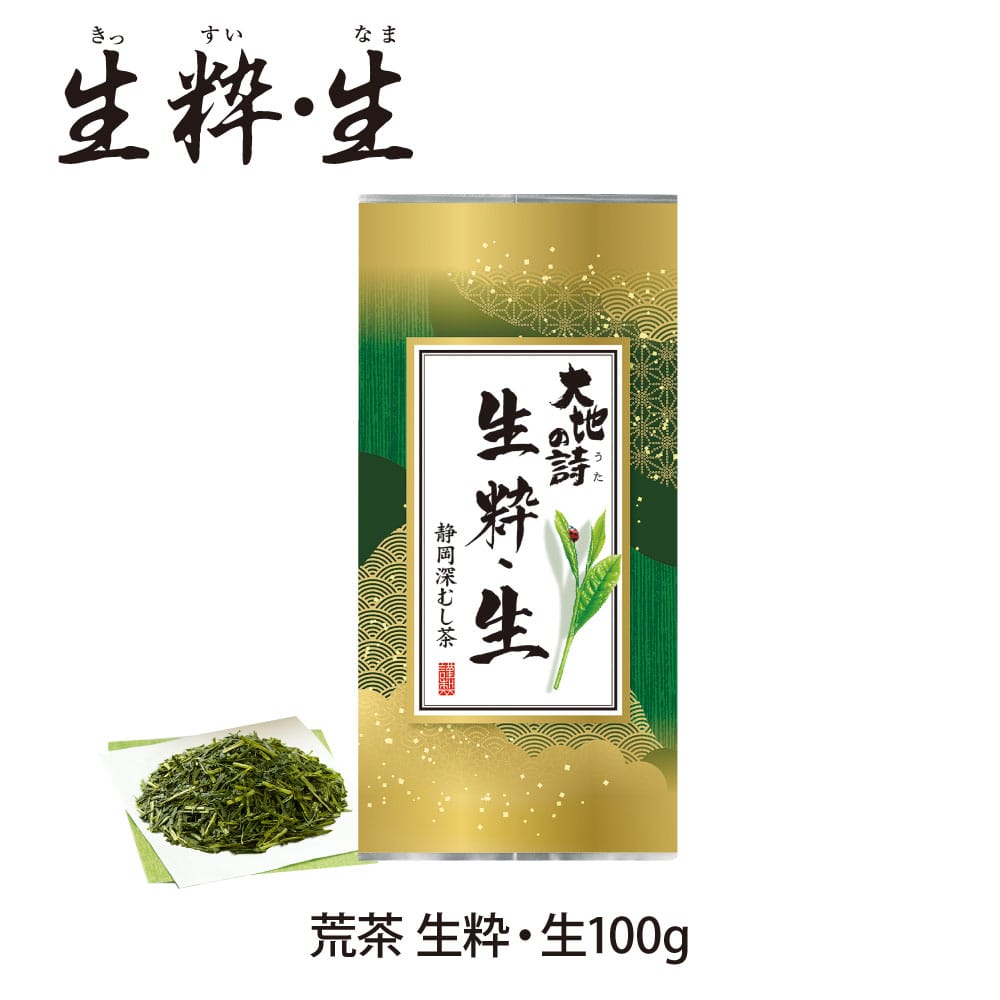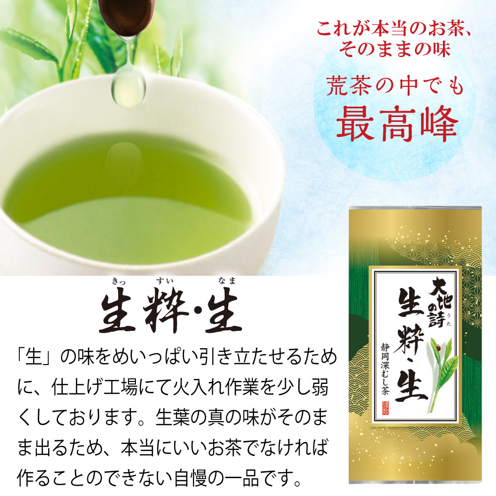飲んでわかる、これが本当のお茶そのままの味です。 ★荒茶の中でも高級茶 土にこだわり技をつくした自信作を直接お届けします。 「荒茶」とは 茶園で摘み取られた生葉は、たくさんの製茶工程を経て「お茶」になります。 茶農家が生葉を摘み取り、荒茶と呼ばれるお茶まで加工します。これが「荒茶」です。 本茶、茎茶、芽茶、粉茶のすべてが入っており、独特な風味と水色、まろやかな味がお楽しみいただけます。 見た目の良さより、飲んで美味しい「荒茶」 茶葉は粉っぽく見た目はあまり良くありませんが、きれいな濃い緑色、まろやかな甘みと深いコクのあるお茶です。さらに、茶葉が細かいため水に溶けない体に良い有効成分も摂取できます。 お茶っ葉まるごと!健康成分たっぷりの「静岡の荒茶」 「生粋・生」は名前の通り 荒畑園の「荒茶シリーズ」と似ていますが、もっとも異なる点は「生」の味をめいっぱい引き立たせるために、仕上げ工場にての火入れ作業を少し弱くしております。生葉の持つ真の味がものまま出るため、本当にいいお茶からでないと作ることができない自慢の逸品です。 口に含んでみてください 「生」の青い若葉の味がスーッと体を巡り、まるで荒畑園のお茶工場にいるような気分になるはずです。青っぽい生っぽい味をお楽しみ下さい。 生粋・生は、一番茶となります。 お茶には4種類のカテキンが含有されています。 ガレート型カテキンには、脂肪やコレステロールの吸収を抑える働きがあります。 荒茶工場で蒸す工程を経ると8種類のカテキンになります。 1~4のカテキンの1部が変化してガレードになります。 1.カテキン → 5.カテキンガレード 2.エピガロカテキン → 6.エピガロカテキンガレード 3.ガロカテキン → 7. ガロカテキンガレード 4.エピカテキン → 8.エピカテキンガレード ※ガレードには渋味成分があります。 お湯で淹れるとガレード(渋味成分)が溶け出して渋味を感じるお茶になります。 水出し(氷水出し)の場合は、カテキンやガレード(5~8)が溶け出しにくいまろやかな味になります。 氷水出し茶の場合は、深蒸し茶なら3分経てば淹れられます。(煎茶は5分) ※茶葉が細かく、水色も煎茶より濃いためです。