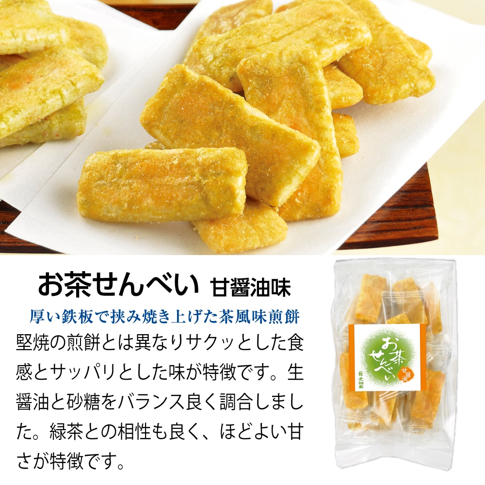 荒畑園オリジナル さくっと軽やか♪ 生醤油と砂糖をバランス良く調合しました。 緑茶との相性もよく程よい甘さが特徴です。 厚い鉄板で挟み焼き上げた茶風味煎餅 堅焼きの煎餅とは異なりサクッとした食感とサッパリとした味が特徴です。 お子様から高齢者まで年齢層に関係なく人気があります。