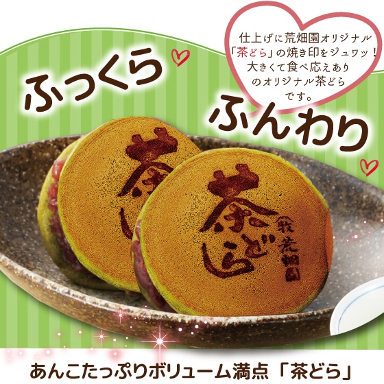 牧之原名物、生地は鮮やかな緑茶色。和菓子職人がていねいに焼き上げました! さんさん茶入りのフレッシュバターが甘さを引き立てます。 厚い鉄板で挟み焼き上げた茶風味煎餅 「荒畑園の茶どら」は当園のさんさん茶をねりこんだ鮮やかな緑茶色の生地。 ふっくらなのにしっとりしたその食感は数%単位の配合調整で何度も試作し、使用する日本酒にまでこだわった和菓子職人がひとつひとつ丁寧に焼き上げているから。