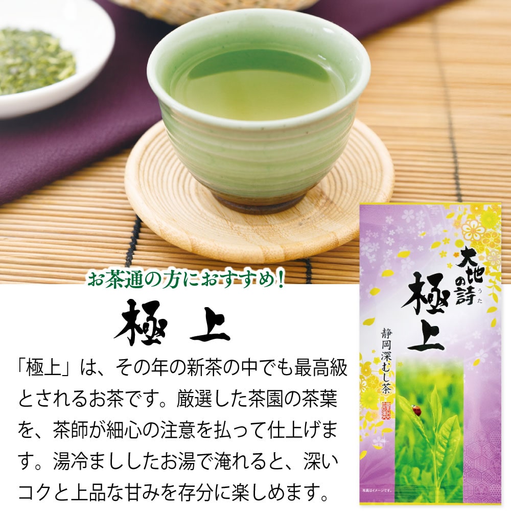 最高級のお茶を愛でる! こだわりの上級茶 高級のお茶を愛でる【極上】 その年の新茶のすべて[芽合い・香り・味・水色]において高級とされるお茶です。厳選した茶園で1芽1芽丁寧に摘み取り、茶師が細心の注意を払って揉みあげた当園の高級品です。 湯冷まししたお茶で淹れ、ゆっくりと廻しながら注いでいただくと深いコクと上品な甘みが楽しめます。ぜひ、当園の高級品をご堪能ください。 荒畑園のこだわり【土へのこだわりが良質な茶葉を育む】 高級の香り、旨み、安心へ 自然還元農法で栽培、深むし製法で仕上げだからおいしさと栄養が違う 理想的な土壌で育ったお茶の樹は丈夫で強く、肉厚で緑が濃い、旨みの詰まった茶芽を芽吹かせます。荒畑園では秋に全ての茶園に山草を敷きつめ、さらに当園手作りのもみがら堆肥を作り、土中に微生物を増やす土づくりを行っています。そのため茶園の土はふっかふかで肥料の分解は早く、お茶の樹の根からたっぷり栄養成分が吸収されます。 「深蒸し茶」とは 深い濃い緑色、香りは上品で、味は旨みコクがあり、まろやかな味わいが特徴です。 牧之原台地は平らな地形のため日照時間が長いので、葉肉の厚い栄養成分をたっぷり含んだ葉が育ちます。 その葉を、通常の2~3倍の時間をかけて葉の芯までしっかりと深く蒸すことにより、成分が分解され、タンニン(苦渋味)が減り、アミノ酸のテアニン(甘み)が増してまろやかで緑色の濃いお茶に出来上がります。 【極上】は、一番茶となります。 深蒸し茶の淹れ方 深蒸し専用急須の帯網急須をお使い下さい。味わいたい時はぬるめのお湯で、上品な渋味を味わいたい時は熱めのお湯でどうぞ。 2~3人用の340ccくらいの急須であれば、カレーのスプーン1杯の茶葉の量を急須に入れ、お湯を入れる。急須8文目くらいのお湯の量が好ましい。急須をゆっくり回し、茶葉を開かせる。湯呑みに回しつぎをしていく。最後の一滴まで出し切り、緑が濃いほど美味しくなります。