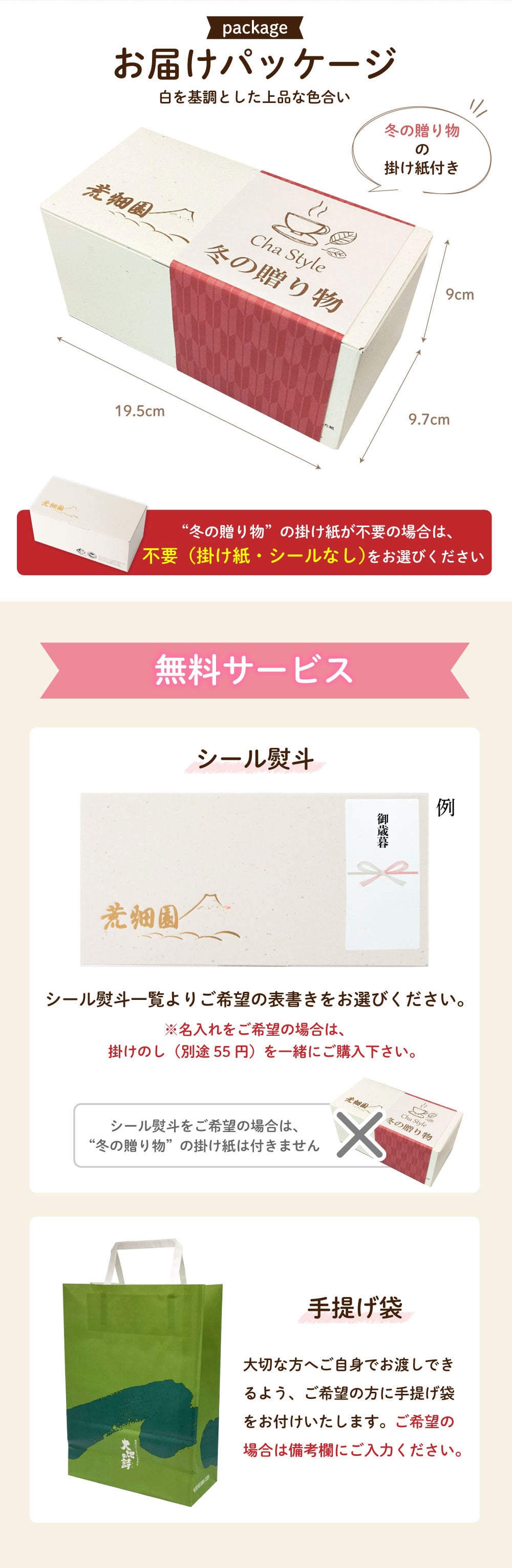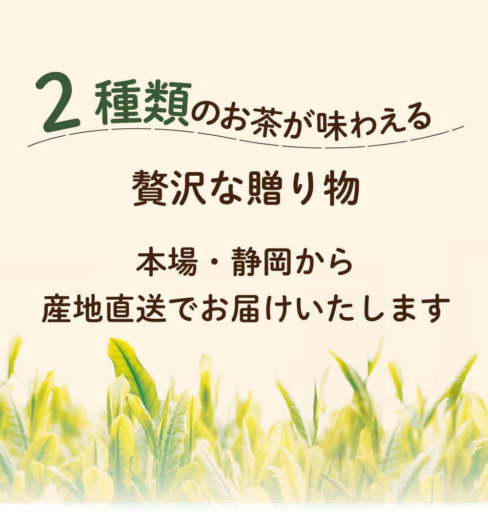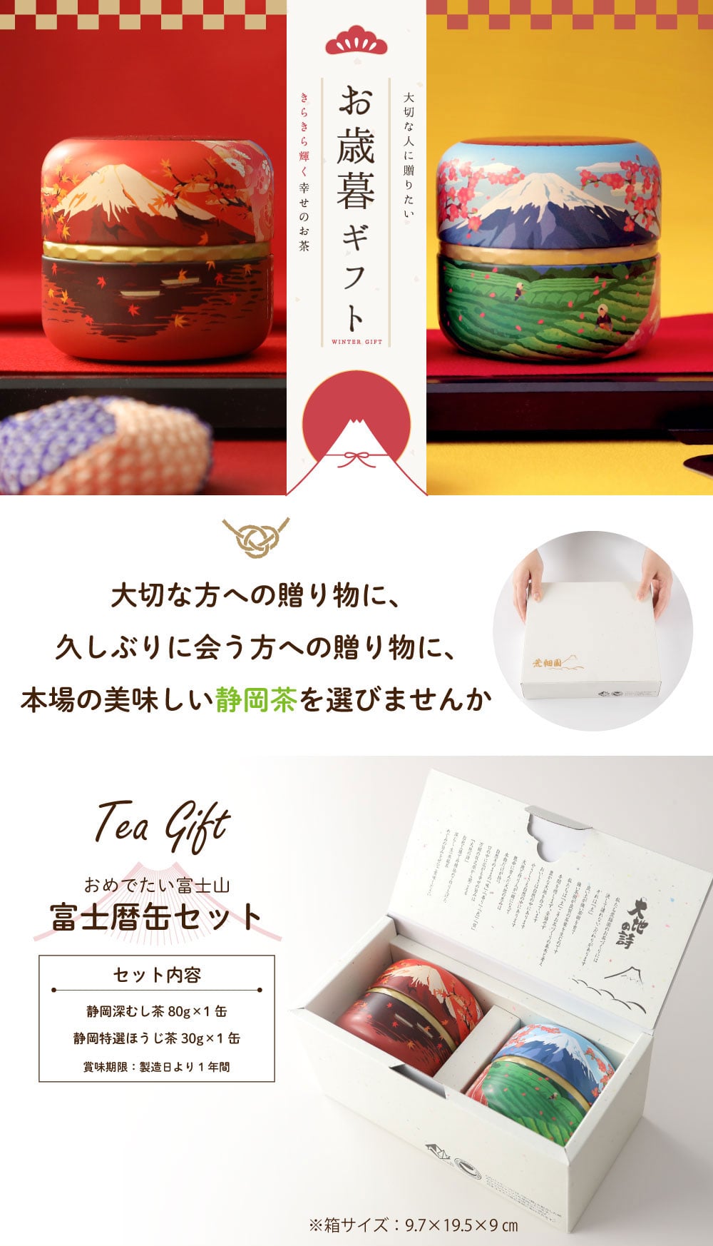 縁起の良い赤富士缶と青富士缶のセット! 富士暦缶2本箱入 お茶好きな方にぴったり! どなたからも喜ばれる贈り物! 縁起物の富士山缶に特別な静岡茶をたっぷり詰めました! 赤富士 … 厄除け・商売繁盛・願望成就 青富士 … 縁結び・子孫繁栄・健康長寿 感謝の気持ちを込めて。 大切な方、お世話になったへの贈り物に是非。 おめでたい富士山でお祝いやご挨拶にもピッタリ♪ 本場・静岡県牧之原から美味しい静岡茶をお届け。 美味しいお茶の時間をプレゼント! 【静岡深むし茶】 普通煎茶の3から4倍長く蒸して作った深蒸し茶は見た目よりを味重視!深蒸し茶ならではの深いコクをお楽しみください。 旨味たっぷりの一番茶を使用。 【特選ほうじ茶】 高級茎茶を強火で丁寧に焙じました。上品な甘い香りがあり渋みは少なめ。食後やお休み前のリラックスのお茶してもおすすめです。