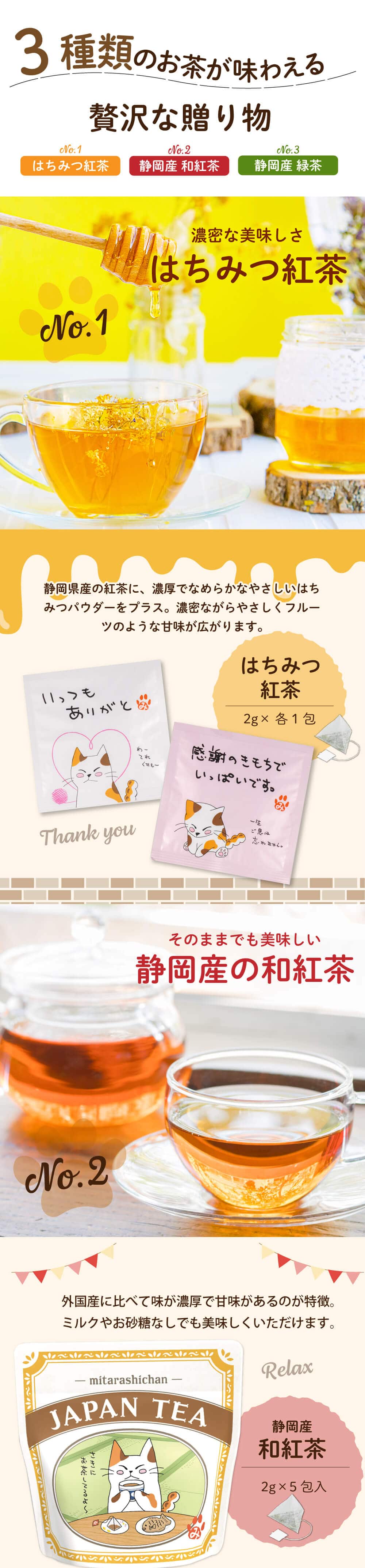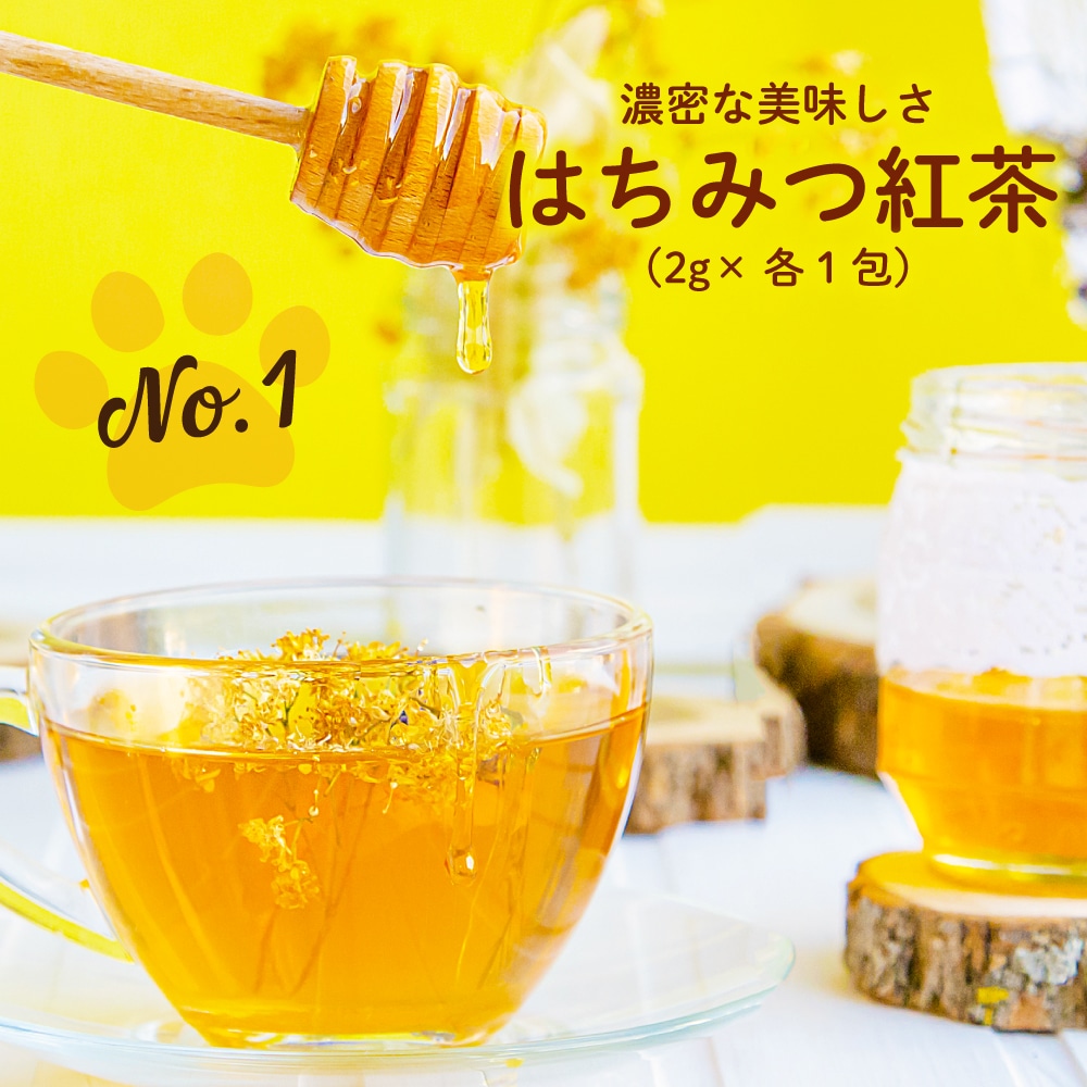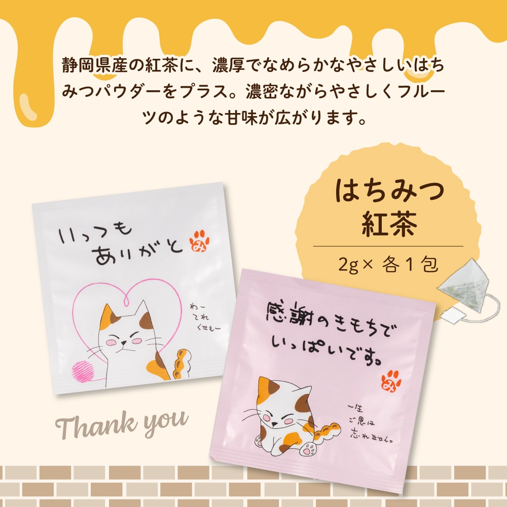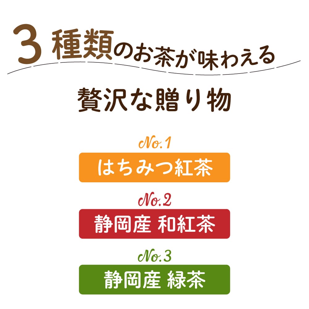 はちみつ紅茶ティーパック:紅茶(静岡県産)、はちみつパウダー(デキストリン、はちみつ)、香料、甘味料(アスパルテーム、L-フェニルアラニン化合物含、ステビア抽出物)