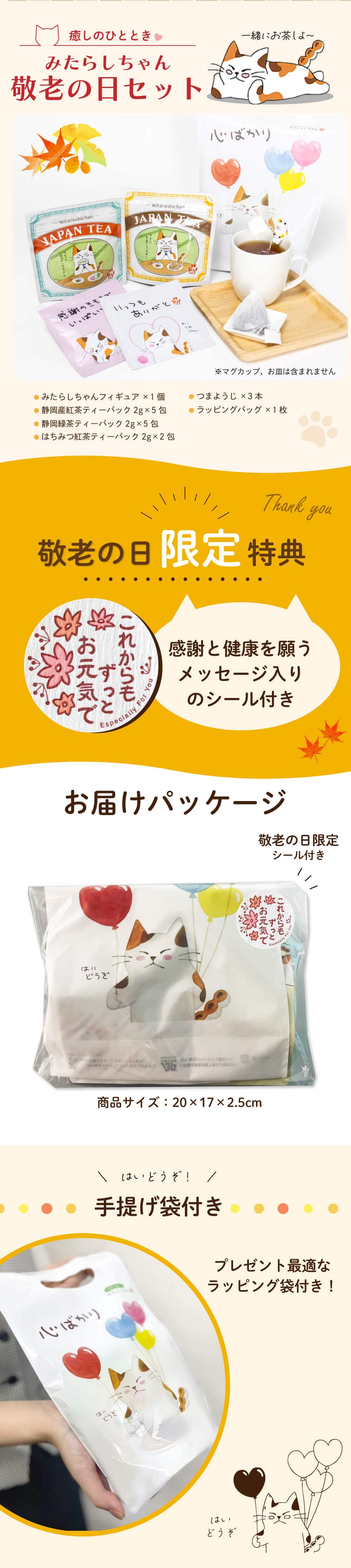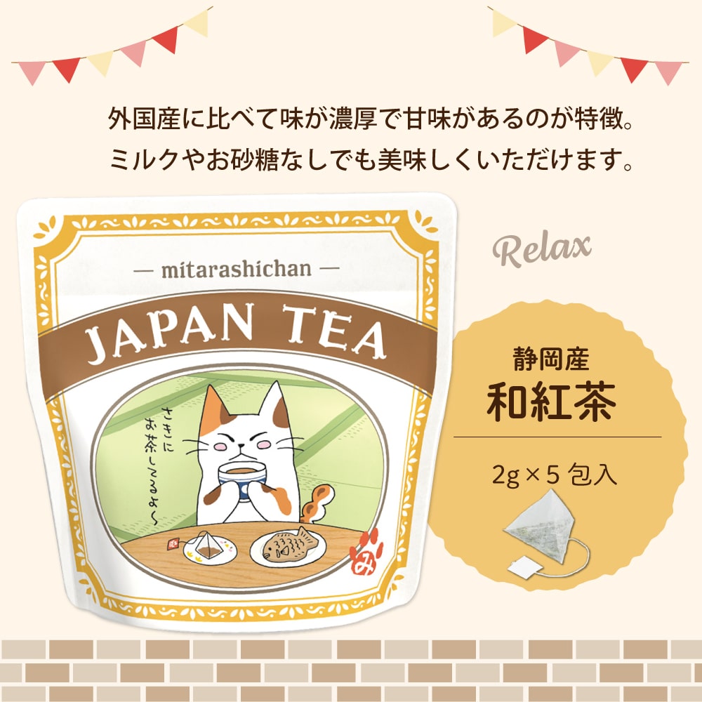 【内容量】 みたらしちゃんフィギュア×1個、静岡産紅茶ティーパック(2g×5包入)、静岡産緑茶ティーパック(2g×5包入)、はちみつ紅茶ティーパック(2.5g×2包)、つまようじ×3本、ラッピングバッグ×1枚