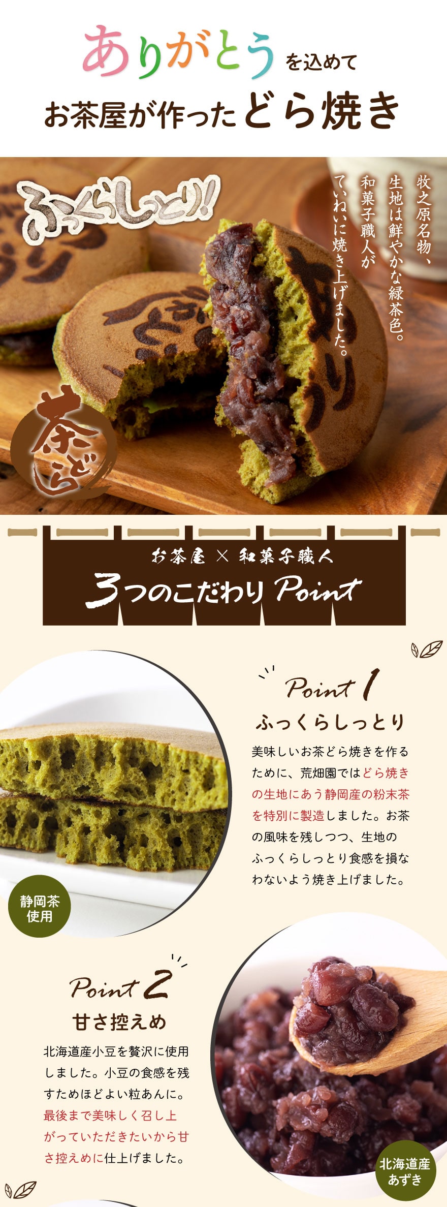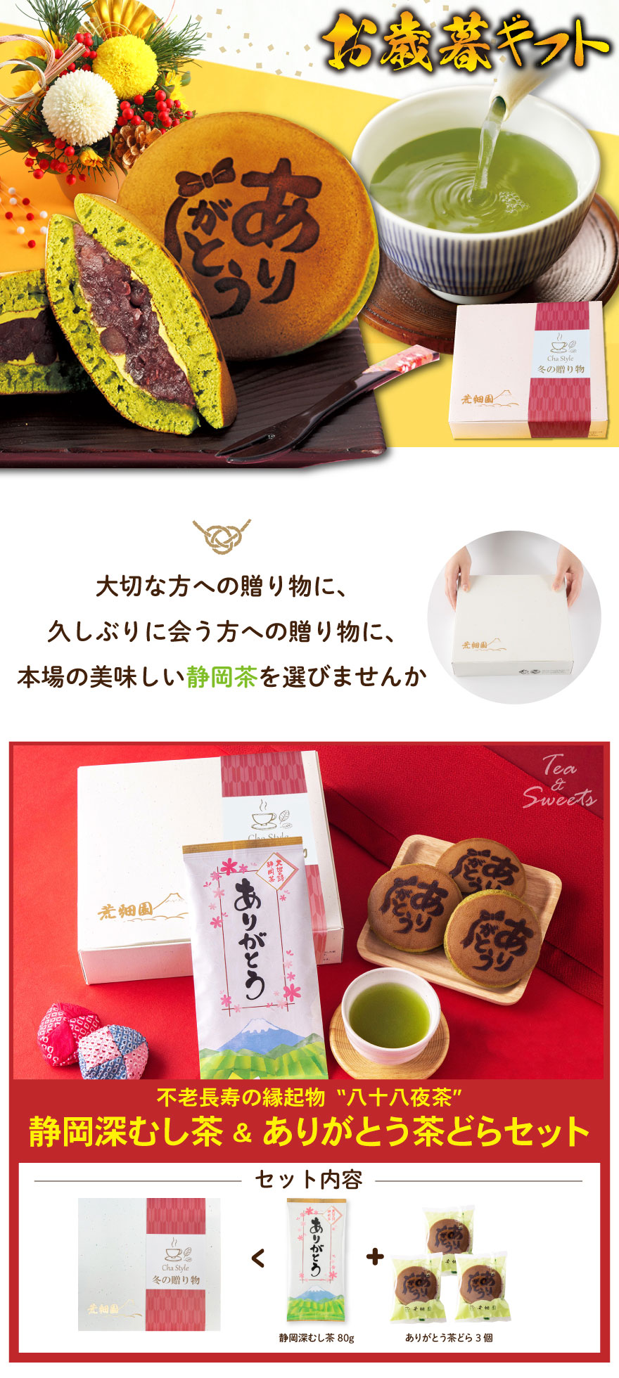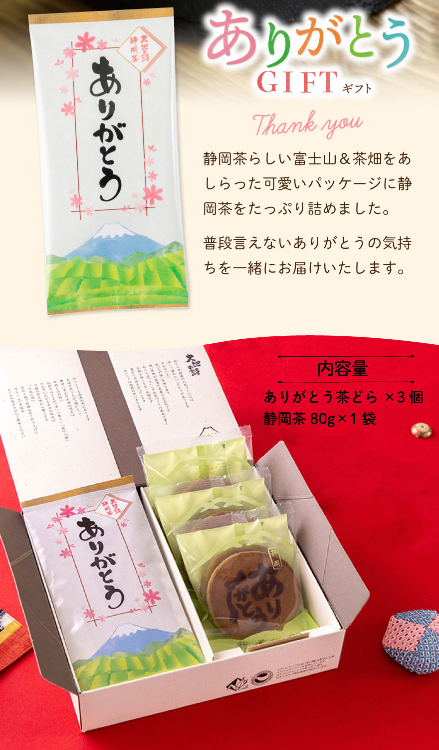 【内容量】ありがとう茶どら×3個、静岡茶(80g)×1袋