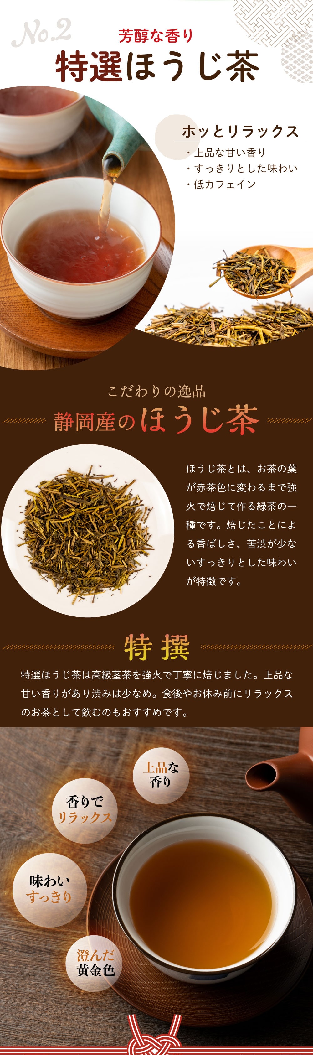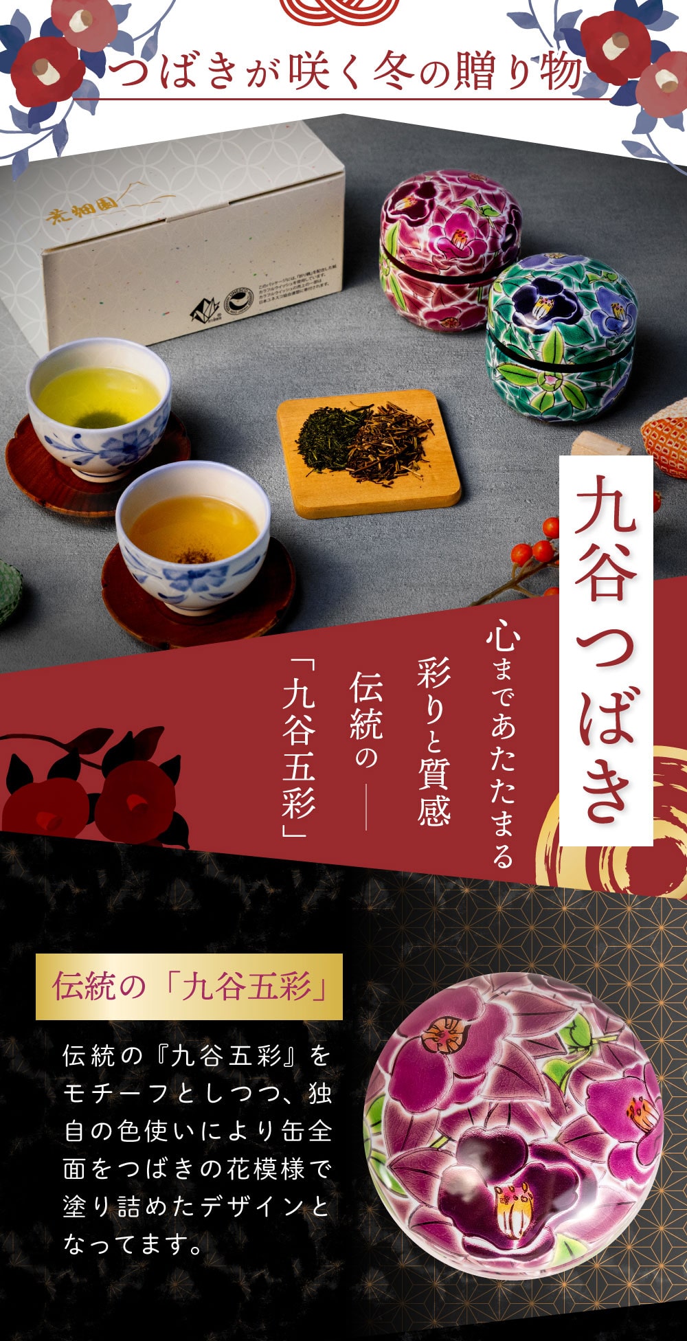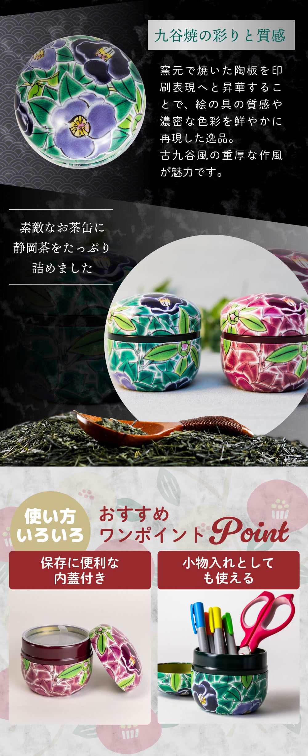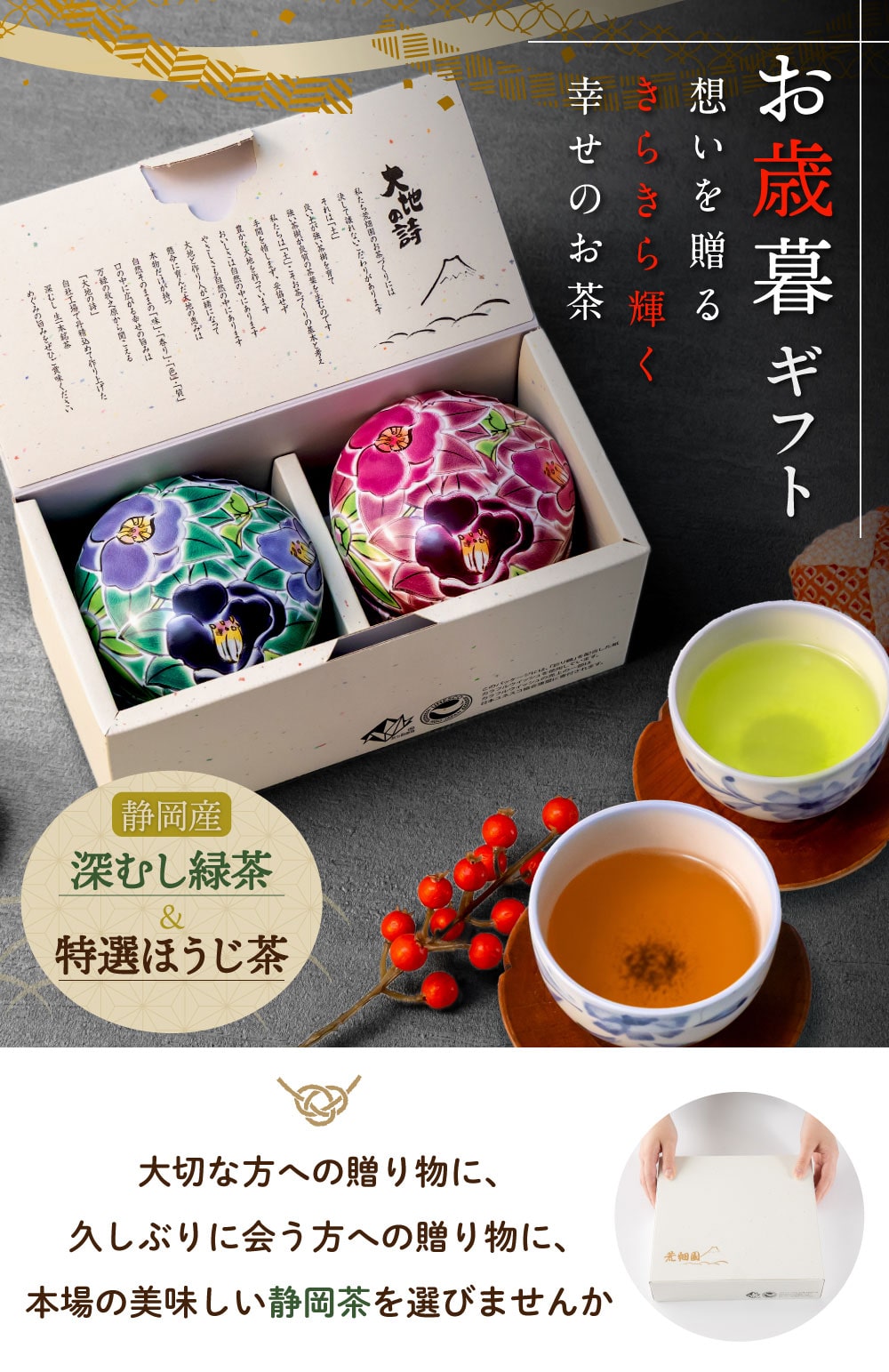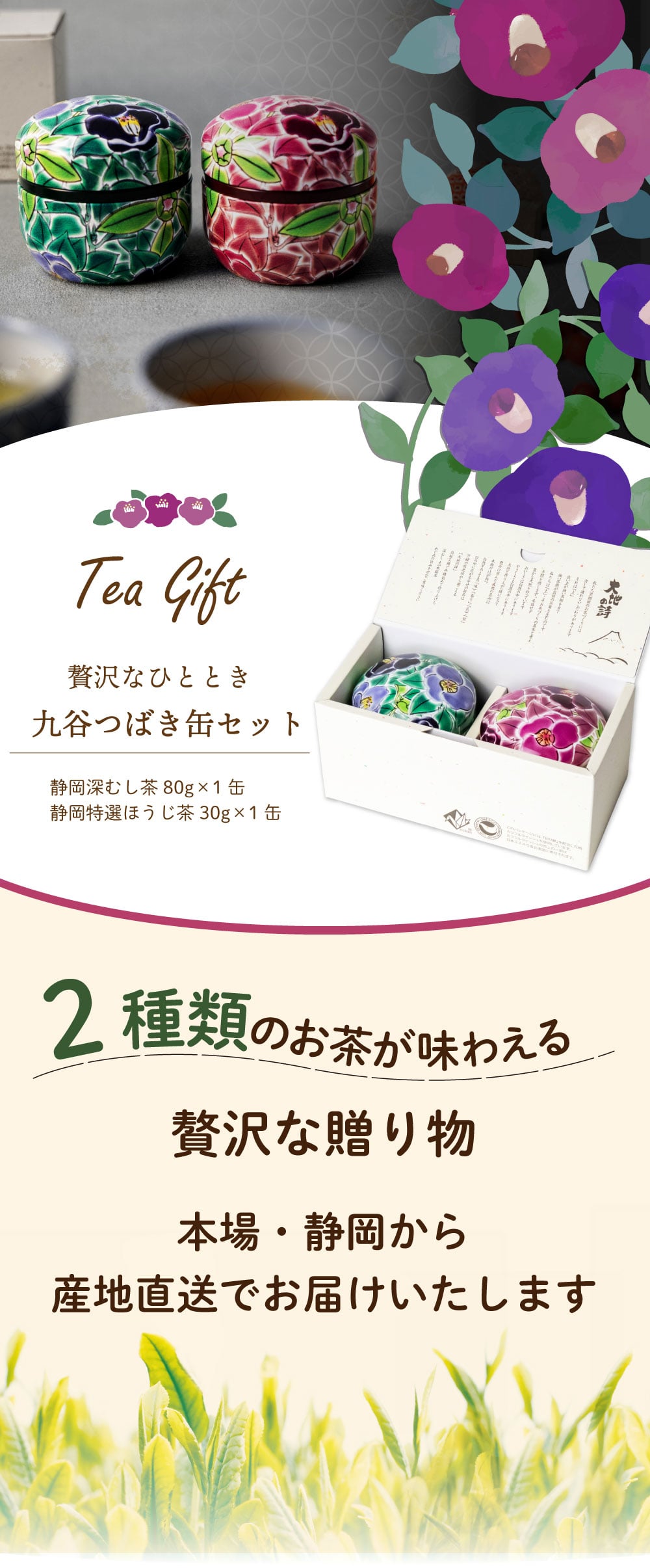 ありがとうを静岡茶にこめて 【お茶】を贈りませんか 大切な方への贈り物に大人気! 静岡深むし茶と特選ほうじ茶がたっぷり詰まった特別なギフト。 こだわりの静岡茶で思いっきり笑顔になってもらっちゃいましょう♪ 感謝の気持ちを込めて♪ 九谷つばき缶2本箱入ギフト 【静岡深むし茶 一番茶】 一番茶とはその年の最初に摘み取られた新芽で作った甘み渋み旨みなど濃厚な味を感じられるお茶です。 一番茶入りだから!お茶らしい渋味の中にほんのり甘味を感じるまろやかな静岡産深蒸し茶に仕上がりました。 【特選ほうじ茶】 高級茎茶を強火で丁寧に焙じました。上品な甘い香りがあり渋みは少なめ。食後やお休み前のリラックスのお茶してもおすすめです。