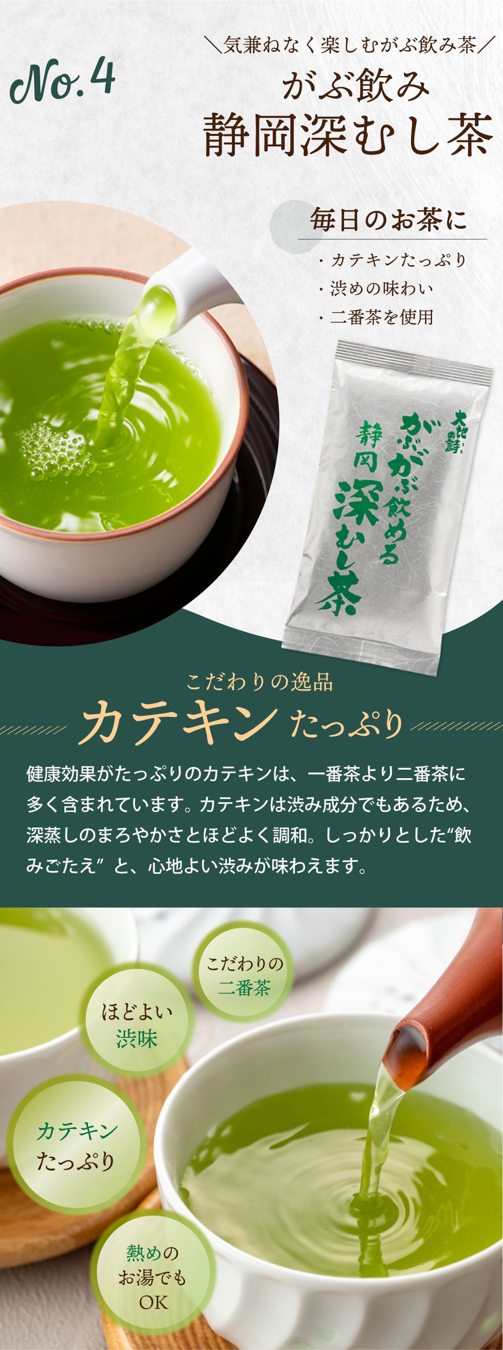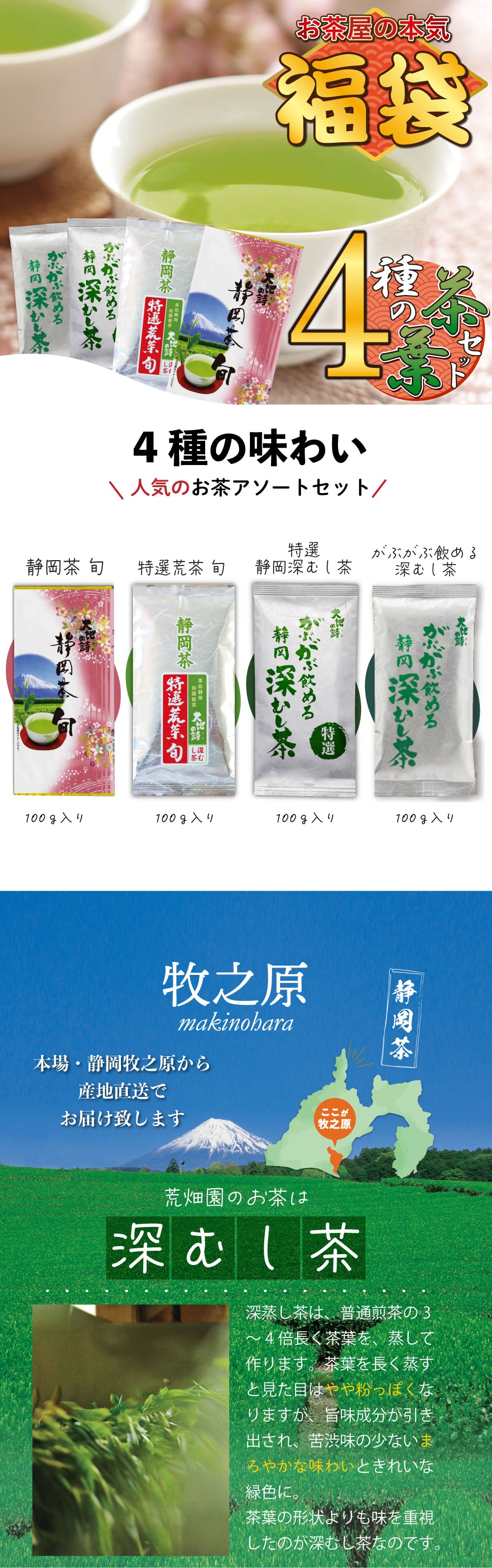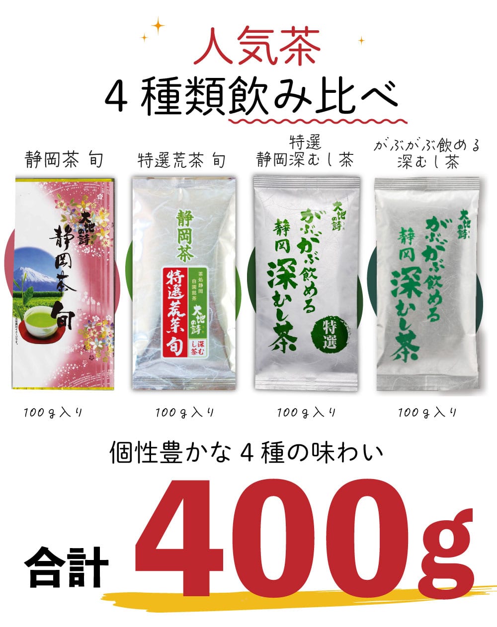 【内容】静岡茶・旬100g×1袋、特選荒茶・旬100g×1袋、特選がぶ飲み静岡深むし茶100g×1袋、がぶ飲み静岡深むし茶100g×1袋