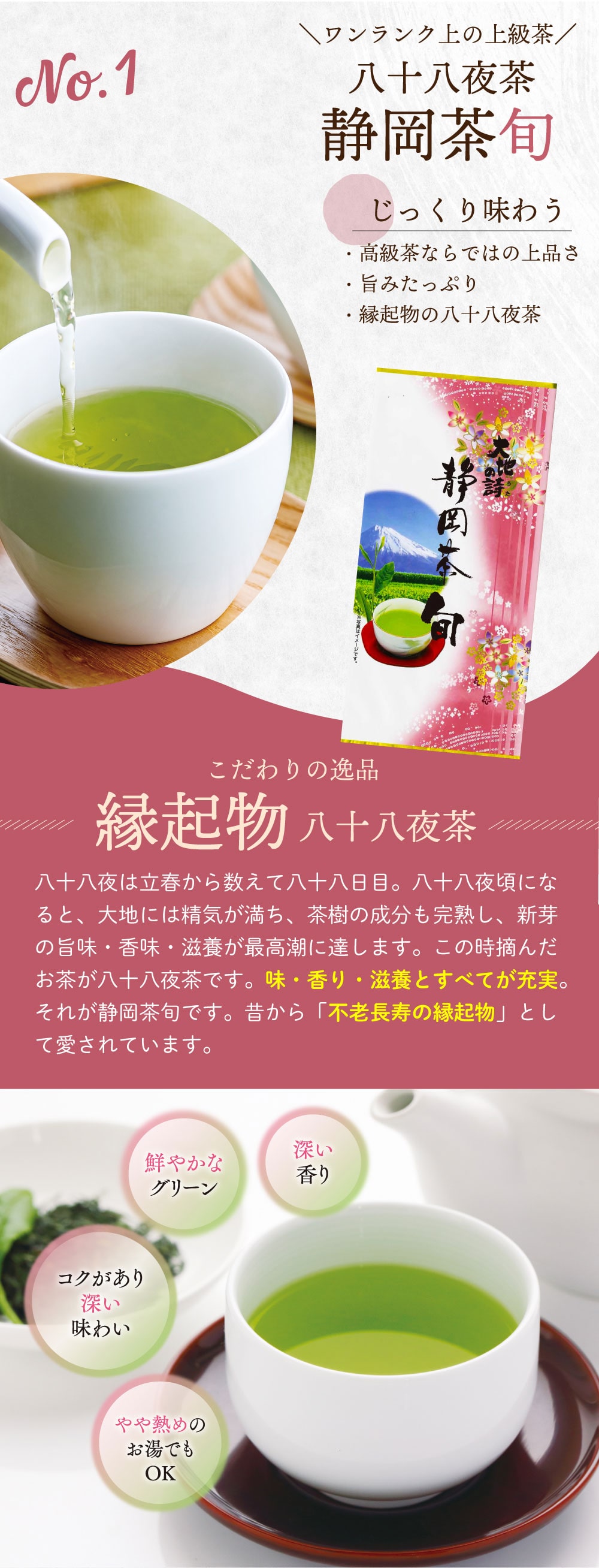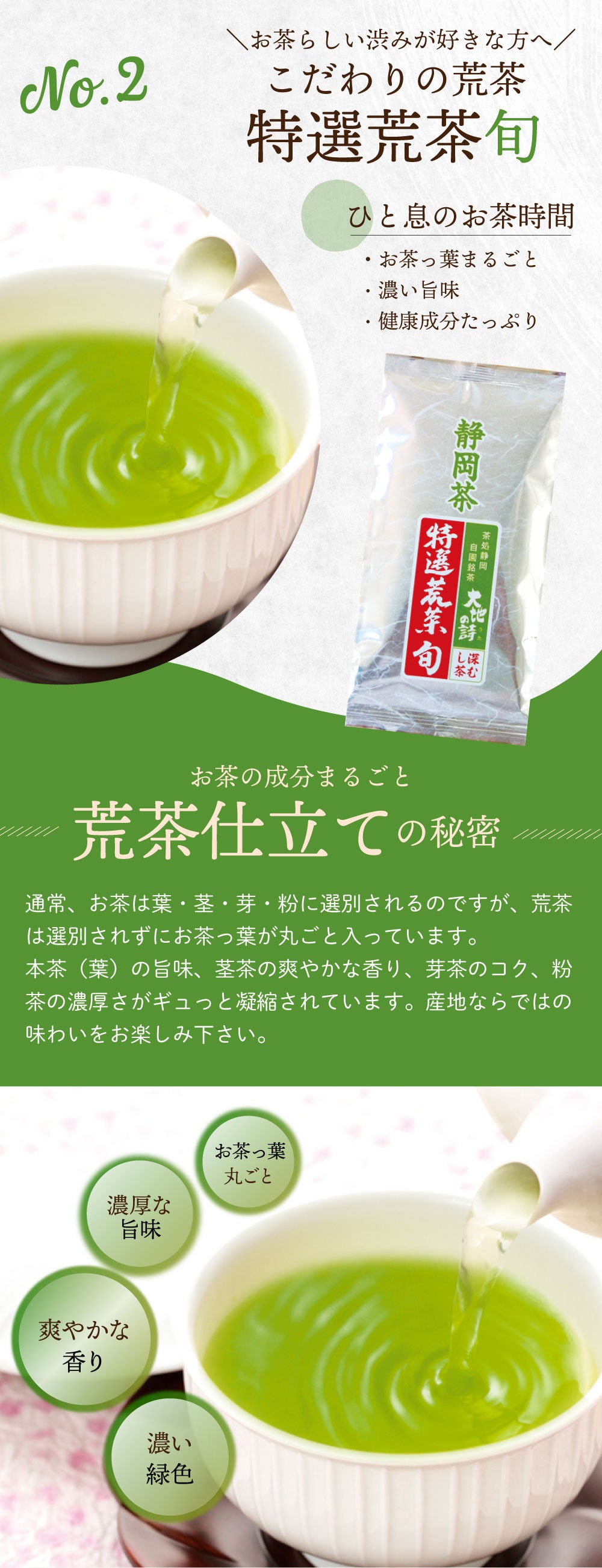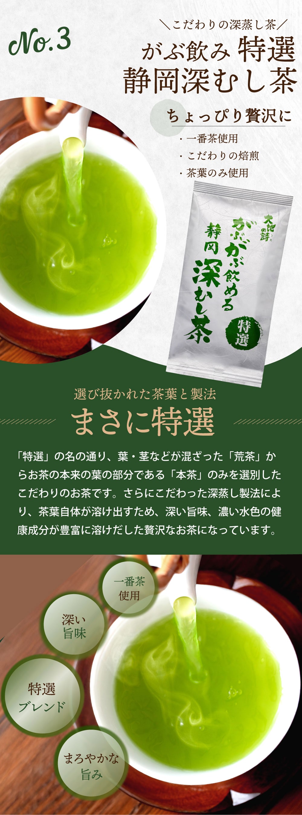 【内容】静岡茶・旬100g×1袋、特選荒茶・旬100g×1袋、特選がぶ飲み静岡深むし茶100g×1袋、がぶ飲み静岡深むし茶100g×1袋