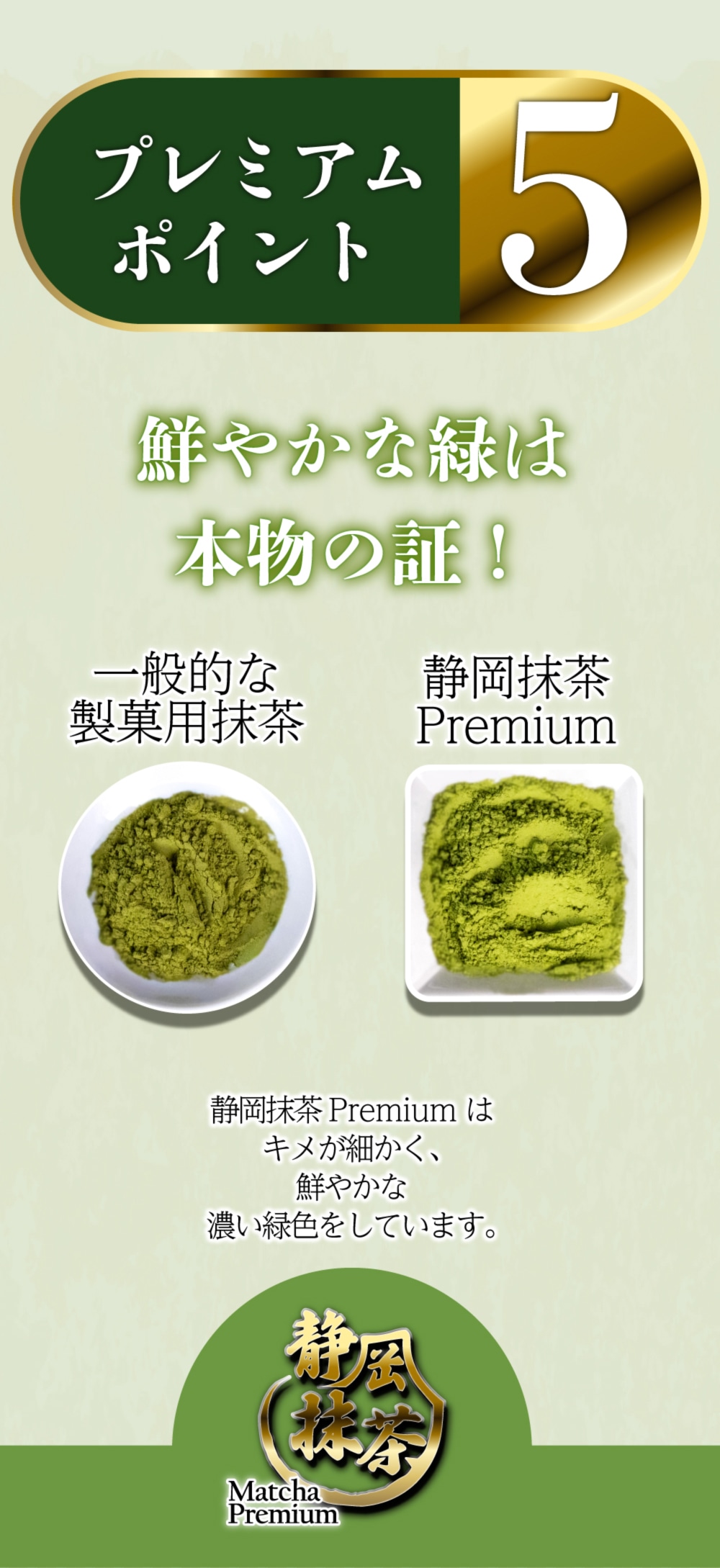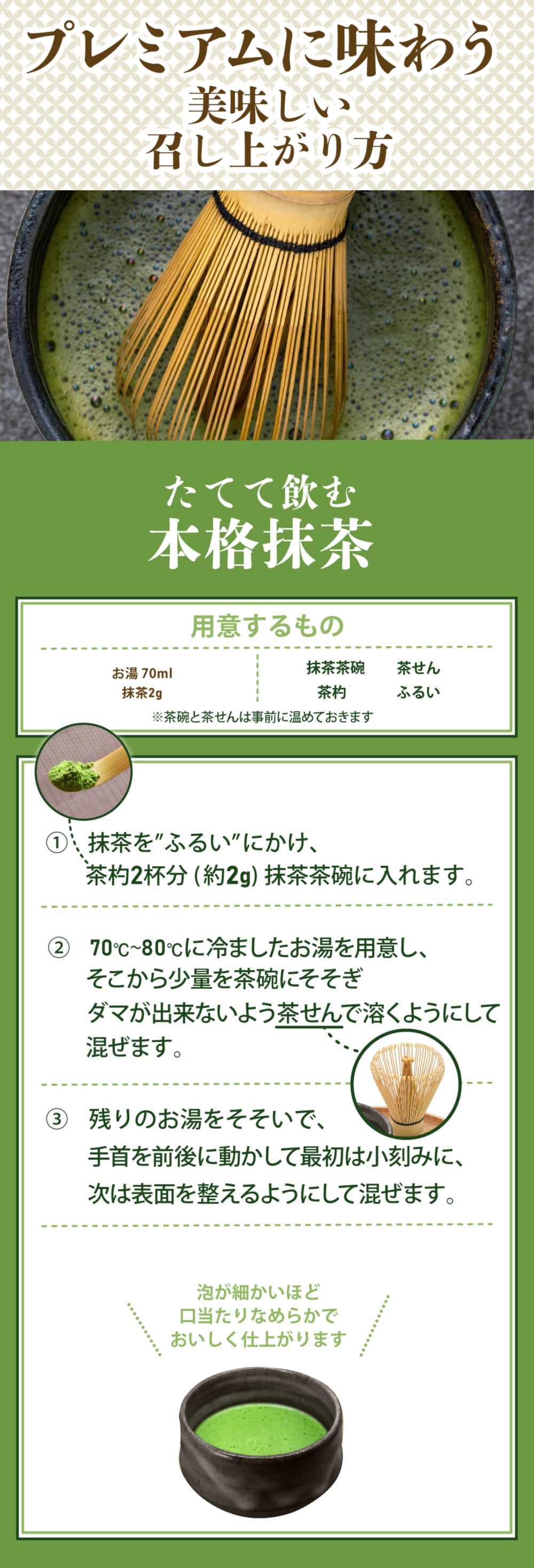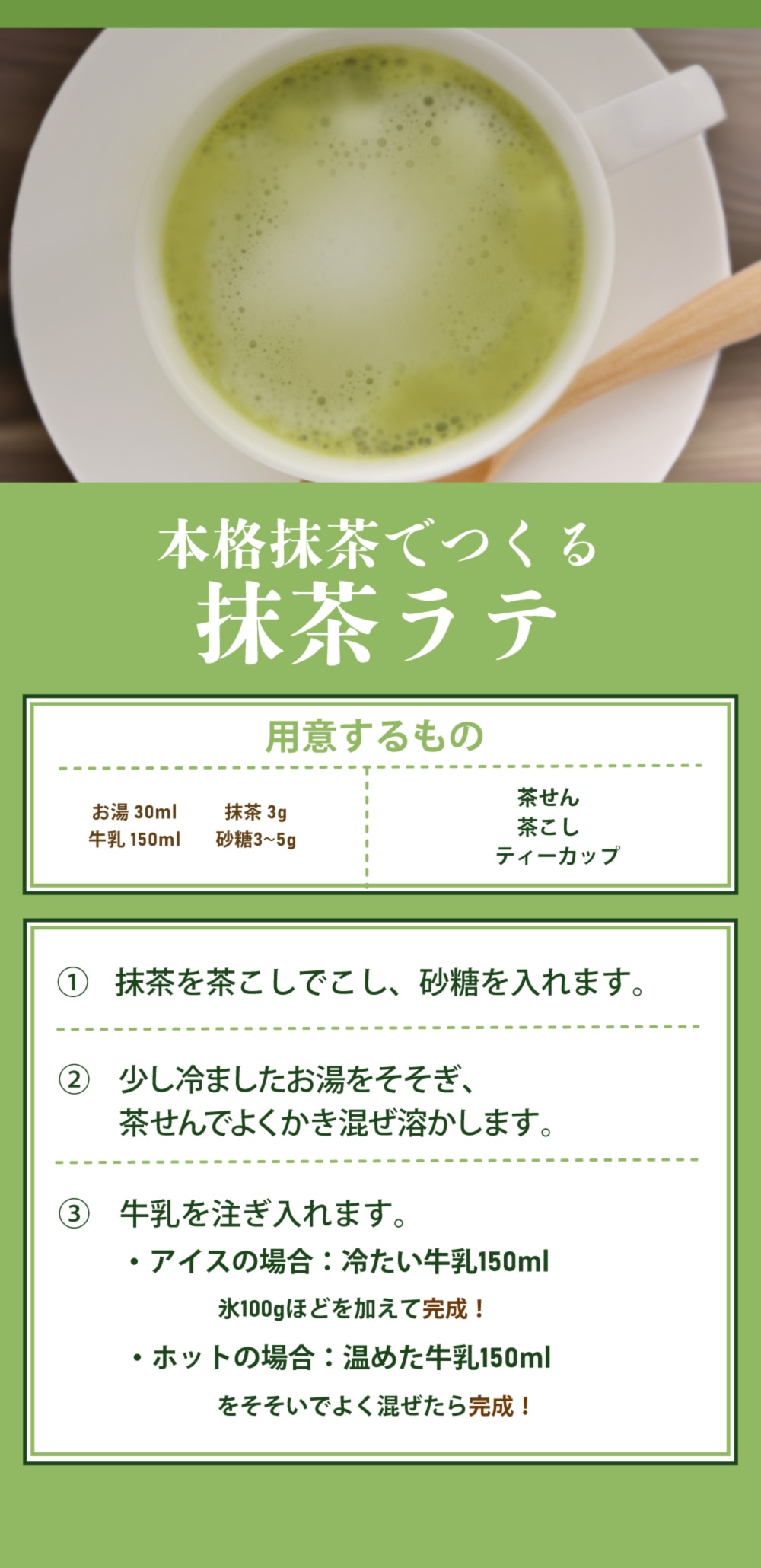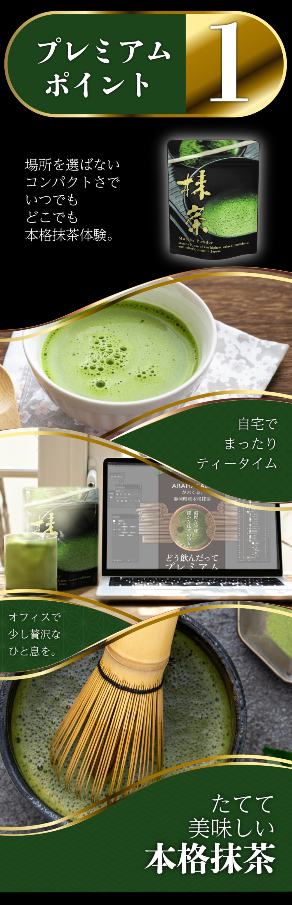 静岡茶100%!本格抹茶! 荒畑園がおくる、100%静岡県産本格抹茶! ご自宅で、オフィスで!場所を選ばず本格抹茶体験! 日本有数の玉露の産地「朝比奈」の高品質な茶葉から生まれた抹茶です。 伝統的な栽培方法、由緒ある歴史をもつ朝比奈産抹茶の 一番茶のみを使用したまさに正真正銘プレミアム抹茶! 味も香りも良い抹茶は体にもいい成分がたっぷり! 茶殻が残らない粉末のため、栄養素まるごと飲み干すことが出来ます。 たてて飲んでも、抹茶ラテにしても美味しい! アレンジいろいろ! 本格抹茶体験をぜひお楽しみ下さい。