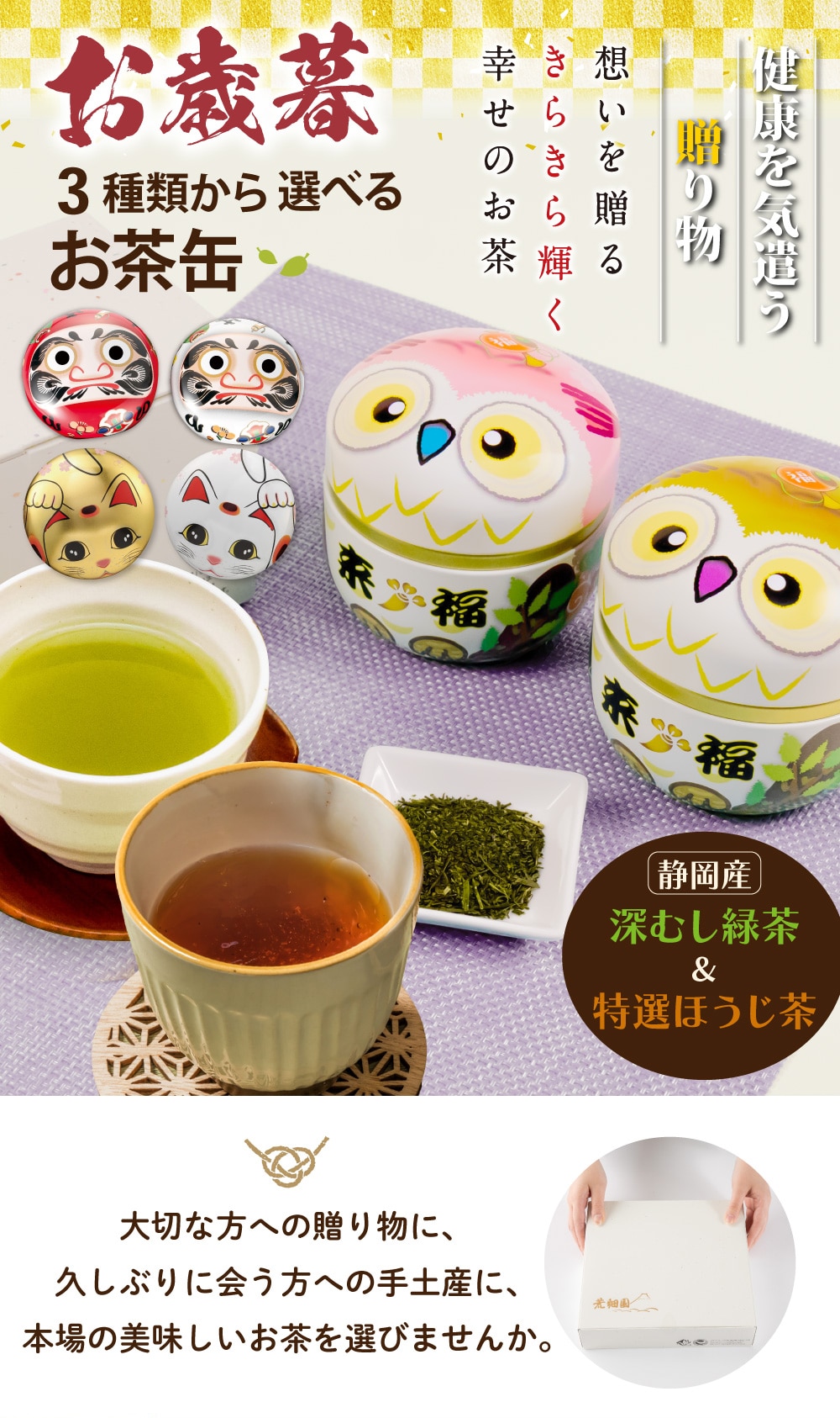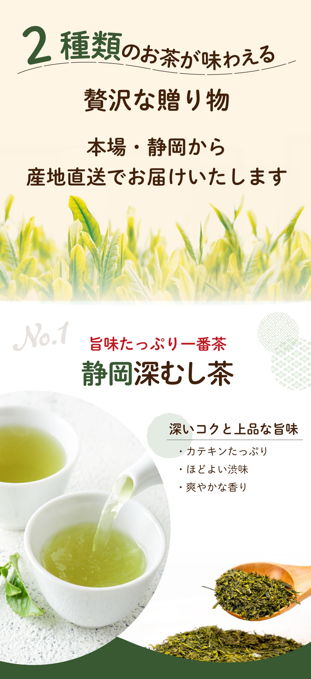 【内容量】静岡深むし茶80g×1缶、特選ほうじ茶30g×1缶 箱サイズ:19.5×9.7×9cm