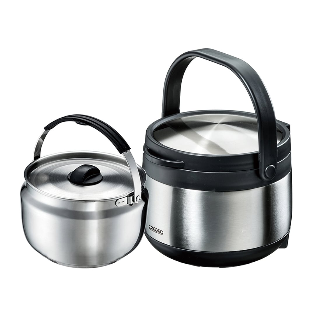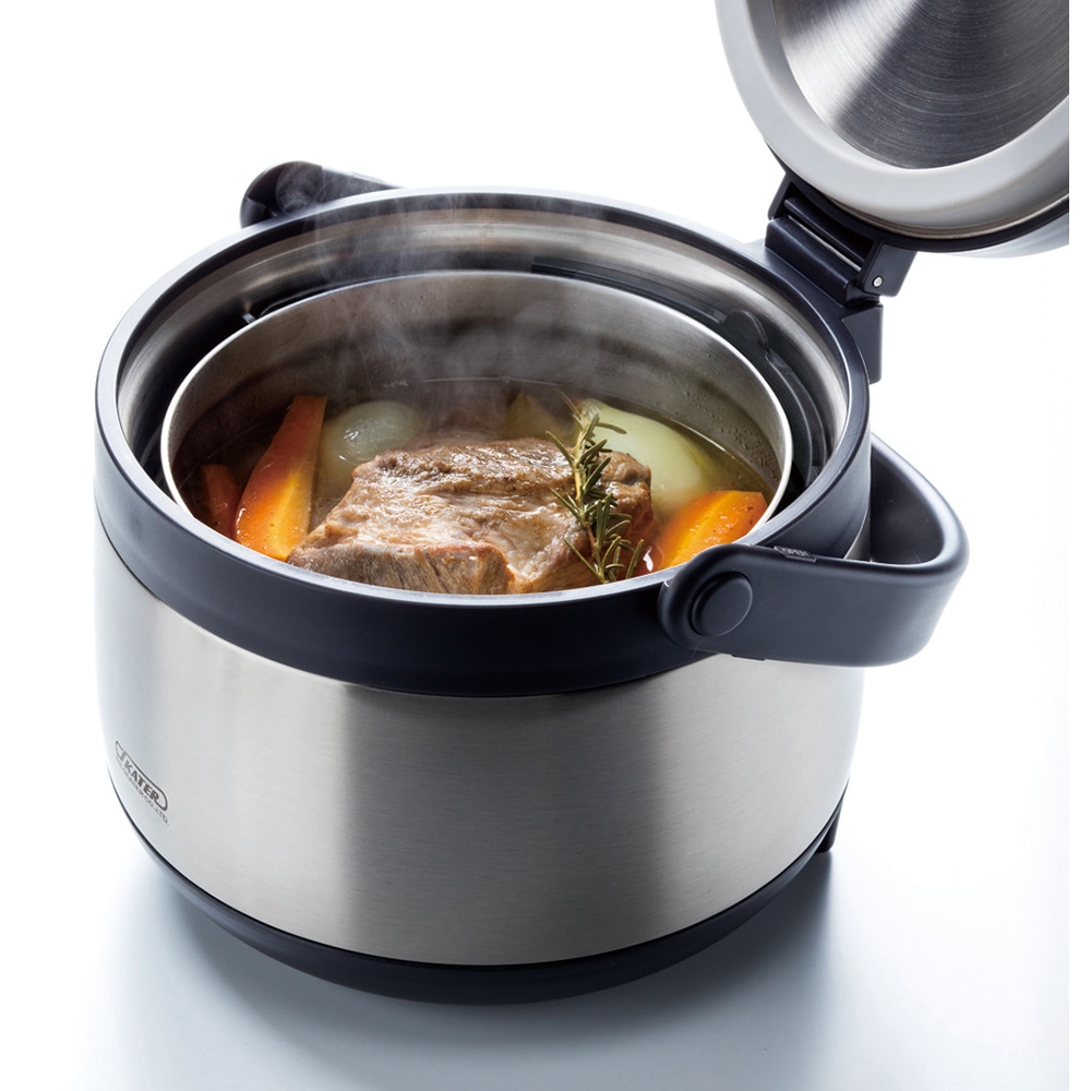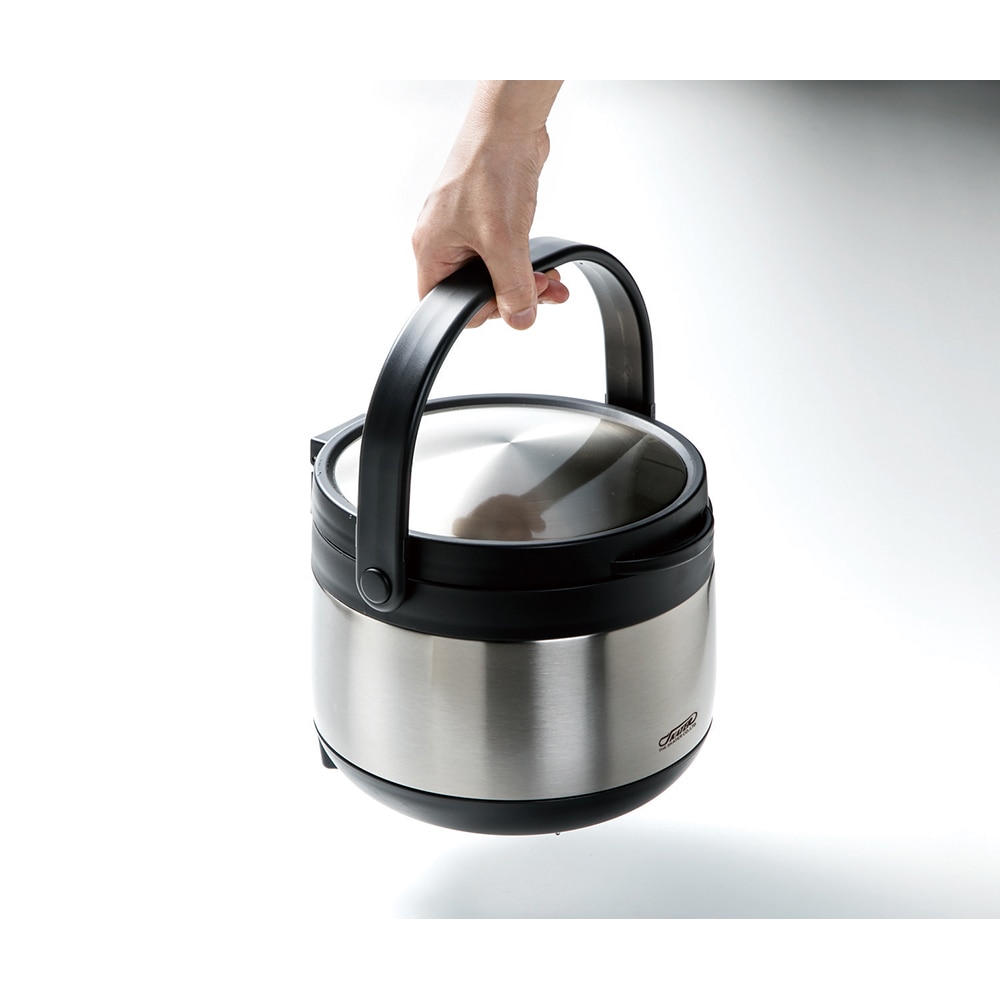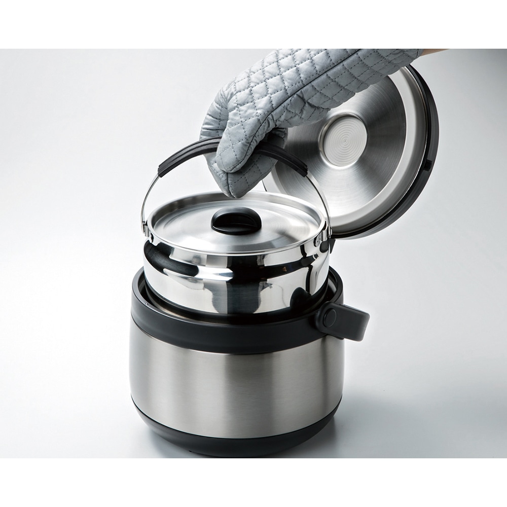 余熱を活かして料理を仕上げる保温調理ができる保温調理鍋。保温器のフタと本体は真空断熱構造で、保温と保冷に効果を発揮。材料を入れて加熱した調理鍋を保温器に移し、余熱で材料に熱を通して調理する。3~5人分の料理を作れる。調理中に付きっきりで様子を見る必要が無く、時間を有効に使える。火ににかける時間が少なくて済むので、ガスや電気代の節約にも繋がる。IH100V・200V、ガス火、電気プレート、ハロゲン、シーズ、ラジエントなど多様な熱源に対応。保温器はハンドル付きで、ロックが掛かるので持ち運ぶ時も安心。保冷もできるので、アウトドアでクーラー代わりにも使える。容量は約2700ml。20種類のレシピ本付き。電子レンジと食洗機は使用不可。