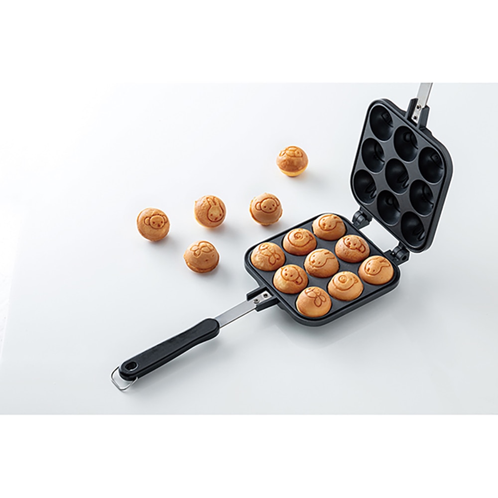 イラストの焼印が可愛いベビーカステラを作れるベビーカステラメーカー。ガスコンロ専用。本体の焼印によって、ベビーカステラの両面にイラストの焼印が付く。ヒンジを外して片面での使用もOK。たこ焼き等のアレンジレシピ付き。電子レンジや食洗機は使用不可。ガスコンロ専用だがSiセンサー付ガスコンロには使えない。