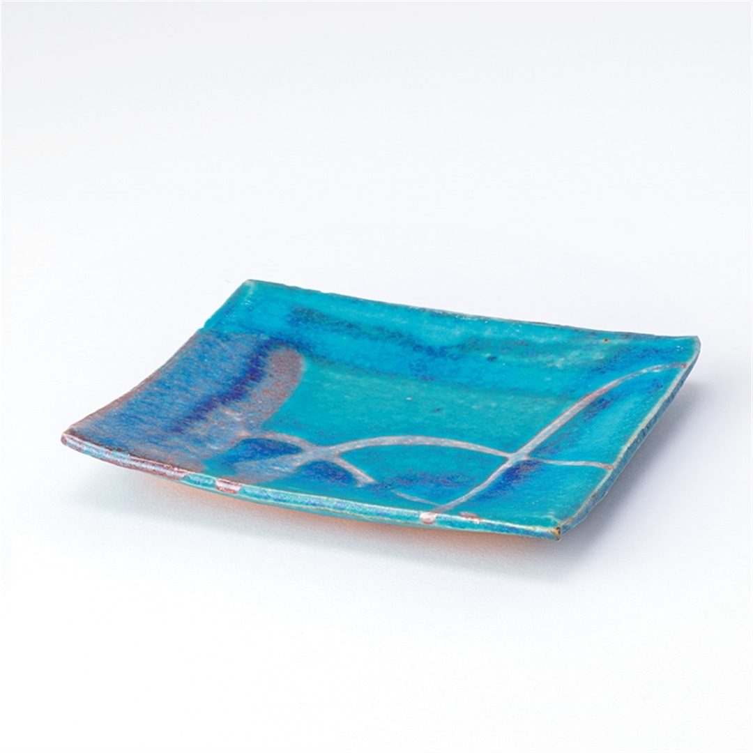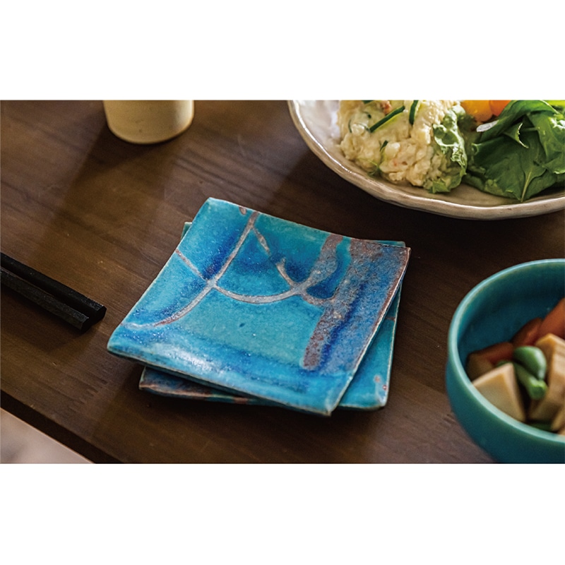 お客様の暮らしを彩る日本の工芸品を揃えた「鴻月」シリーズ。鮮やかなターコイズブルーが印象的な四角い小皿。日本六古窯の1つで、土の質感や風合いを活かし、素朴でありながら自然の力強さを感じられる「信楽焼」。鮮やかな色が食卓に華を添えてくれる。取り皿やケーキ皿など色々と使える。