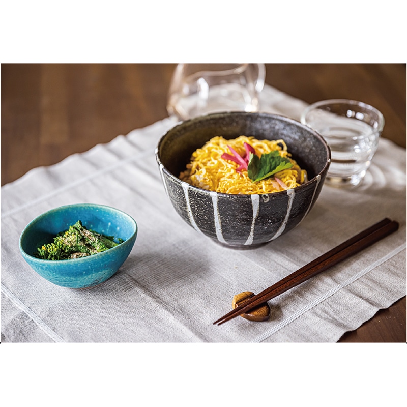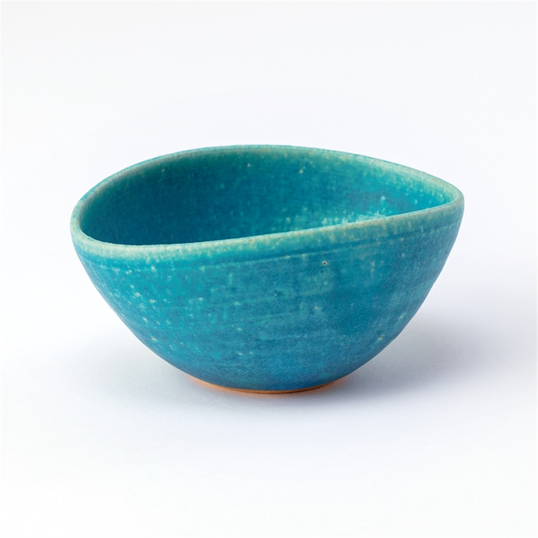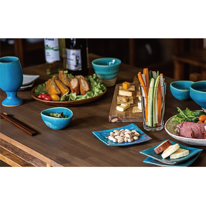 お客様の暮らしを彩る日本の工芸品を揃えた「鴻月」シリーズ。鮮やかなターコイズブルーが印象的な小鉢。日本六古窯の1つで、土の質感や風合いを活かし、素朴でありながら自然の力強さを感じられる「信楽焼」。口が少し狭まった優美な形と鮮やかな色が食卓に華を添えてくれる。
