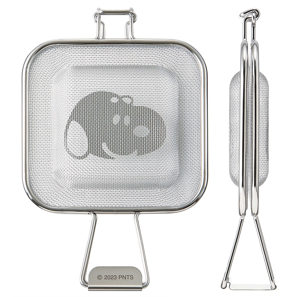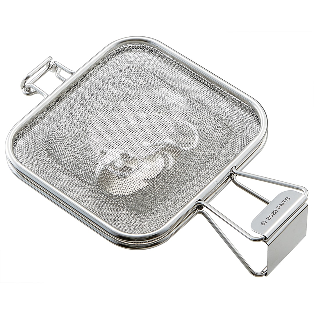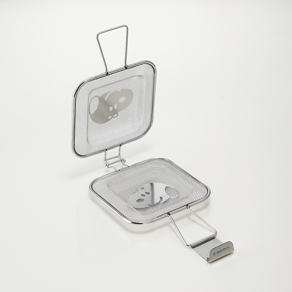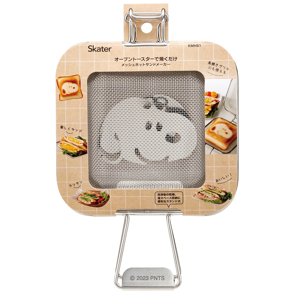 ホットサンドに可愛い顔を付けられるホットサンドメーカー。オーブントースターや魚焼きグリルで使える。食パンに具材を挟んで本体にロックを掛けて加熱。プレートによって焼けない部分ができ、ホットサンドの両面に顔が付く。洗浄後の乾燥、省スペース収納に便利なスタンド式。電子レンジや食洗機は使用不可。本体に触れて火傷しないよう注意する。