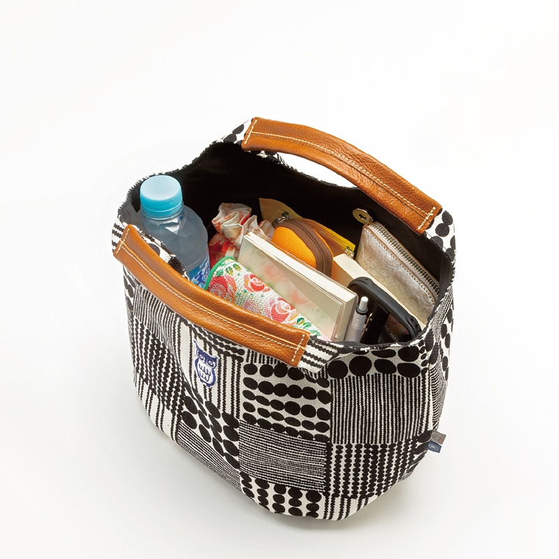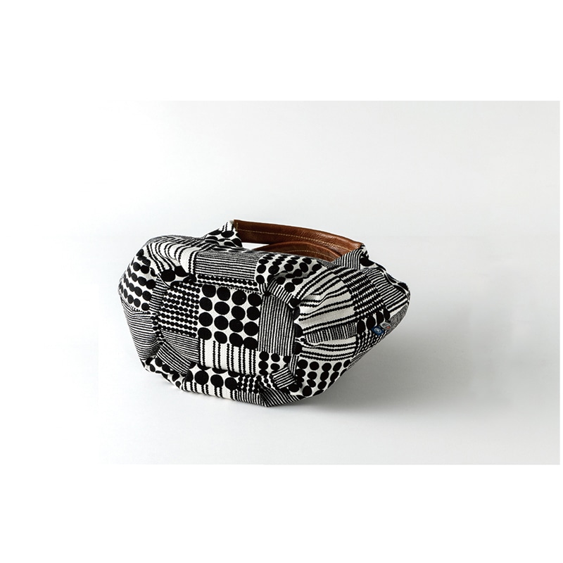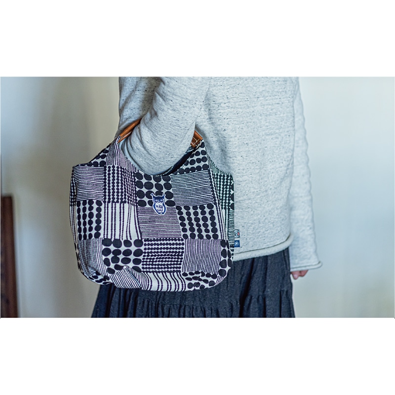 お客様の暮らしを彩る日本の工芸品を揃えた「鴻月」シリーズ。お数珠をモチーフにした和モダンな柄が大人の女性にぴったりなトートバッグ。京都発の人気ブランドkitekiteとのコラボ商品。鴻月を象徴するふくろうの刺繍がアクセント。北欧を感じさせるデザインの生地には細い糸と太い糸でおられた「プリペラ生地」を使用。ハンドルには本革を使用。ぱかっと大きく開くので中身を取り出しやすい。マチ部分を内側に折り込むと丸っこいフォルムになって2通りに楽しめる。職人さんの手仕事による美しい縫製は丈夫で長く使える。洗濯はできない。