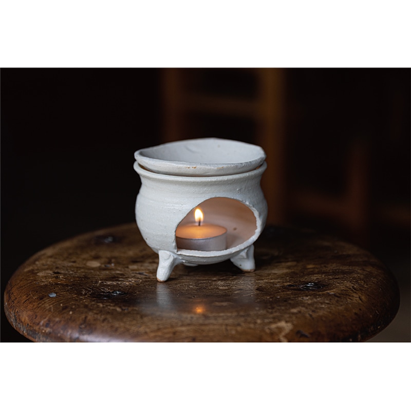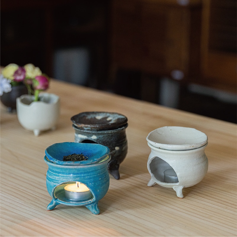 お客様の暮らしを彩る日本の工芸品を揃えた「鴻月」シリーズ。漂う香りで癒しの時間を演出してくれる茶香炉。日本六古窯の1つで、土の質感や風合いを活かし、素朴でありながら自然の力強さを感じられる「信楽焼」。お茶の葉を加熱して、仄かに漂うお茶の香りを楽しめる。キャンドルを使うので、ゆらゆらと揺れる炎も眺められる。受け皿に水を張ってアロマオイルを垂らせば、アロマポットとしても使える。火を使うので、取り扱いには十分な注意が必要。
