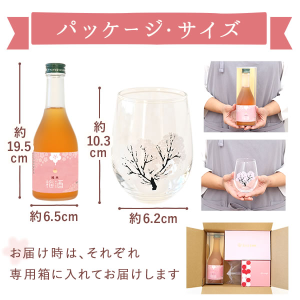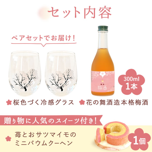 ギフト プレゼント 花 梅酒 日本酒 300ml グラス ペア セット 花の舞 花柄 食器 酒器 おしゃれ かわいい 酒 バウムクーヘン 洋菓子